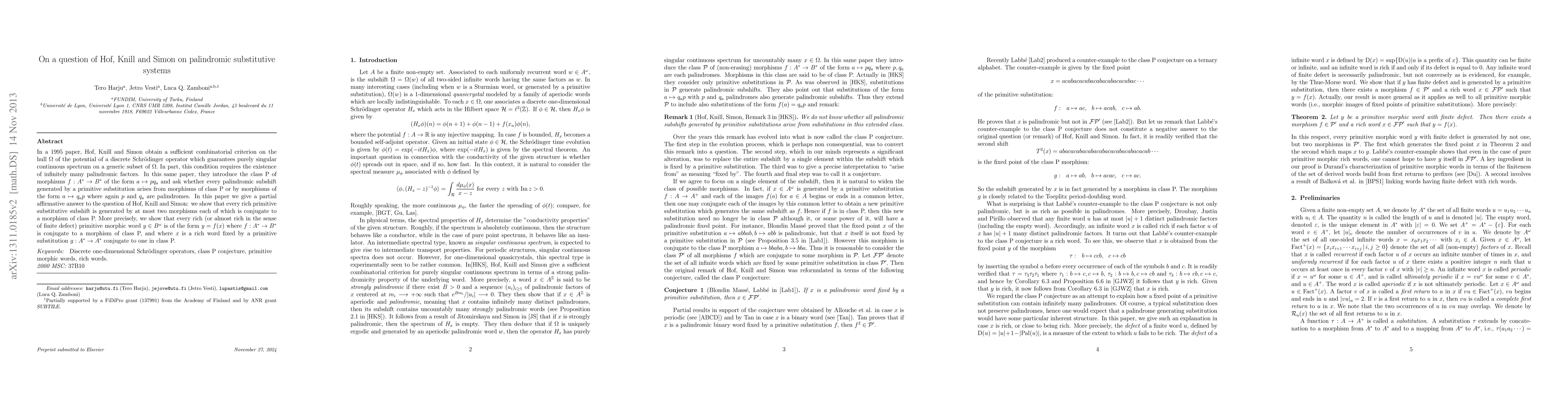 In a 1995 paper, Hof, Knill and Simon obtain a sufficient combinatorial criterion on the hull $\Omega$ of the potential of a discrete Schr\"odinger operator which guarantees purely singular continuous spectrum on a generic subset of $\Omega.$ In part, this condition requires the existence of infinitely many palindromic factors. In this same paper, they introduce the class P of morphisms $f:A^*\rightarrow B^*$ of the form $a\mapsto pq_a$ and ask whether every palindromic subshift generated by a primitive substitution arises from morphisms of class P or by morphisms of the form $a\mapsto q_ap$ where again $p$ and $q_a$ are palindromes. In this paper we give a partial affirmative answer to the question of Hof, Knill and Simon: we show that every rich primitive substitutive subshift is generated by at most two morphisms each of which is conjugate to a morphism of class P. More precisely, we show that every rich (or almost rich in the sense of finite defect) primitive morphic word $y\in B^\omega$ is of the form $y=f(x)$ where $f:A^*\rightarrow B^*$ is conjugate to a morphism of class P, and where $x$ is a rich word fixed by a primitive substitution $g:A^*\rightarrow A^*$ of class P.