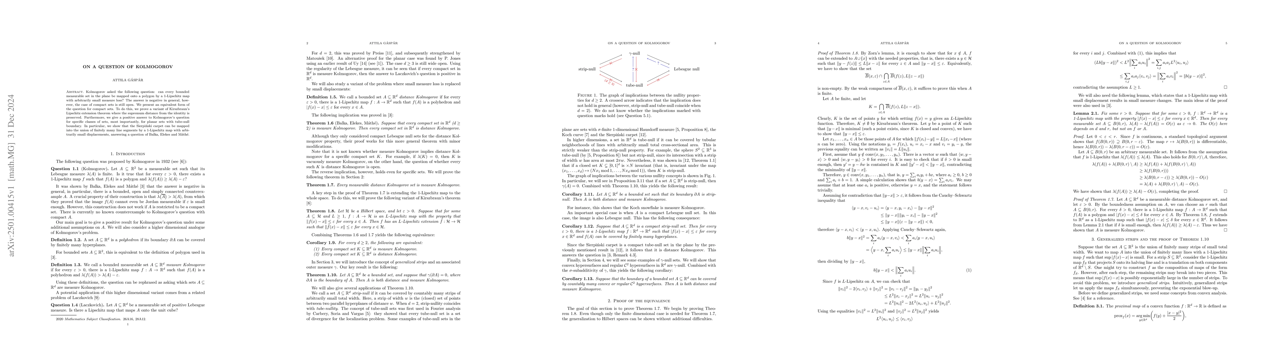 Summary: The paper addresses Kolmogorov's question about mapping bounded measurable sets in the plane to polygons with minimal measure loss, finding that it is generally impossible but proving a variant of Kirszbraun's theorem for compact sets. It also affirmatively resolves the question for planar sets with tube-null boundaries, including the Sierpiński carpet.