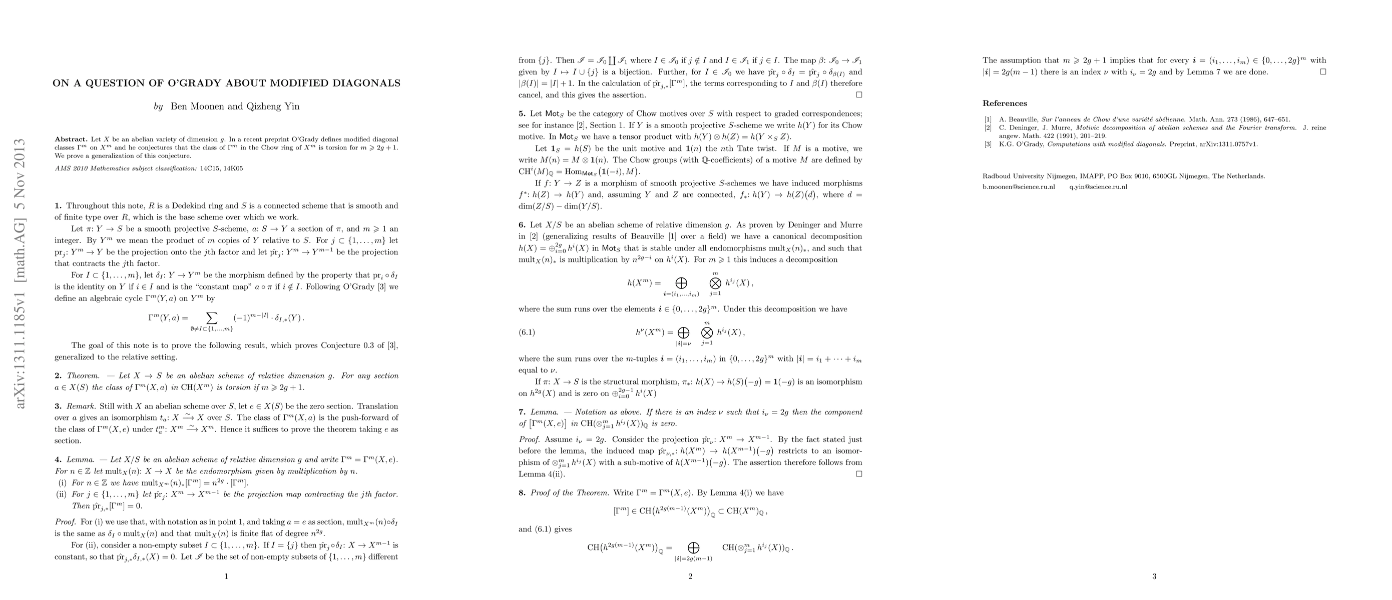 Let X be an abelian variety of dimension g. In a recent preprint O'Grady defines modified diagonal classes \Gamma^m on X^m and he conjectures that the class of \Gamma^m in the Chow ring of X^m is torsion for m \geq 2g+1. We prove a generalization of this conjecture.