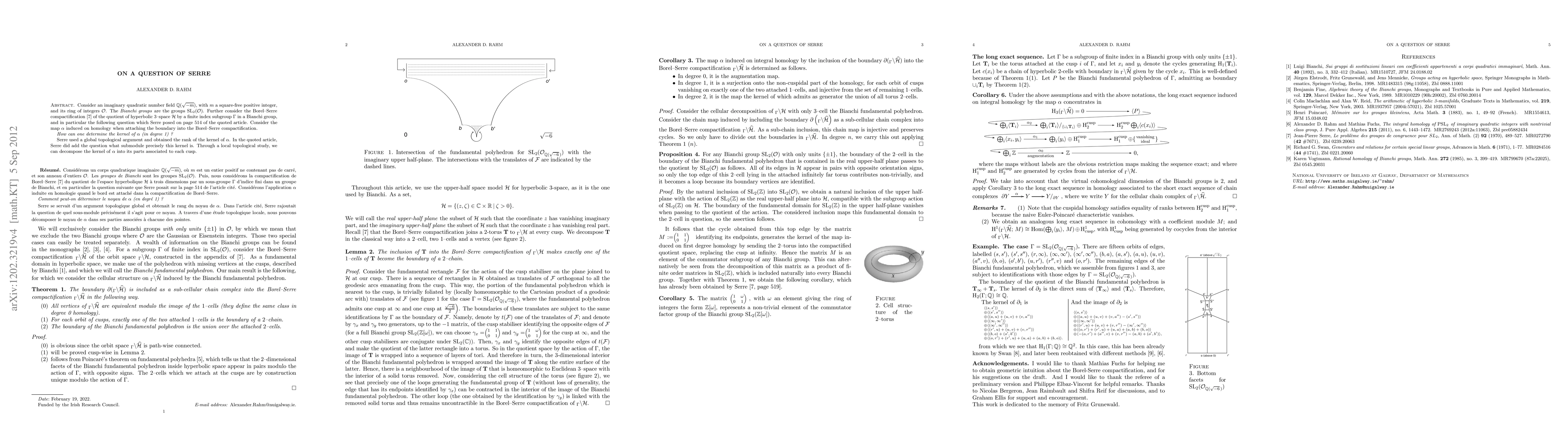 Title: On a question of Serre Summary: This paper investigates the Borel-Serre compactification of the quotient of hyperbolic 3-space by a Bianchi group, focusing on determining the kernel of the map alpha on degree 1 homology. While Serre established the rank of this kernel using global topology, this study employs local topological methods to decompose the kernel into its cusp-associated components.