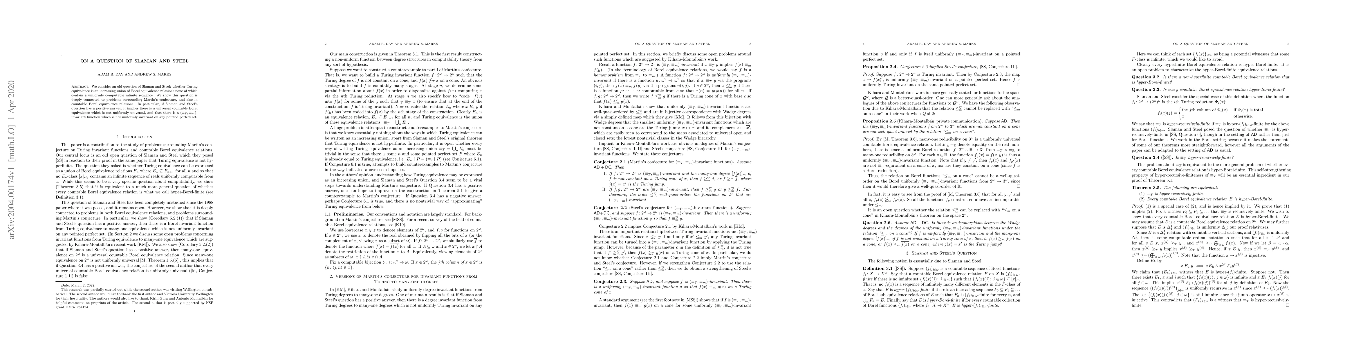 We consider an old question of Slaman and Steel: whether Turing equivalence is an increasing union of Borel equivalence relations none of which contain a uniformly computable infinite sequence. We show this question is deeply connected to problems surrounding Martin's conjecture, and also in countable Borel equivalence relations. In particular, if Slaman and Steel's question has a positive answer, it implies there is a universal countable Borel equivalence which is not uniformly universal, and that there is a $(\equiv_T,\equiv_m)$-invariant function which is not uniformly invariant on any pointed perfect set.