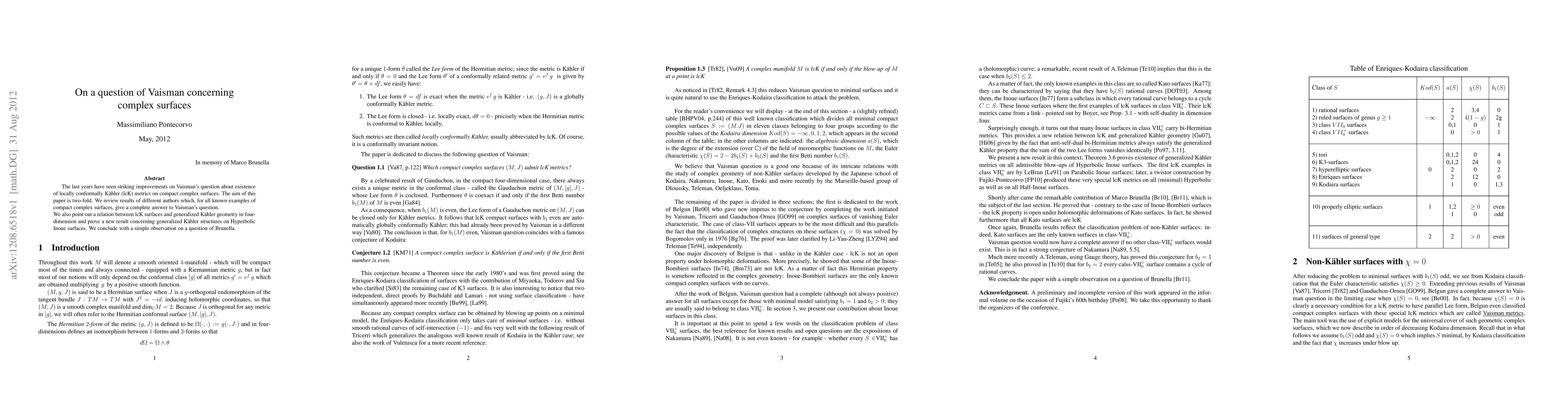 The last years have seen striking improvements on Vaisman's question about existence of locally conformally K\"ahler (lcK) metrics on compact complex surfaces. The aim of this paper is two-fold. We review results of different authors which, for all known examples of compact complex surfaces, give a complete answer to Vaisman's question. We also point out a relation between lcK surfaces and generalized K\"ahler geometry in four-dimension and prove a new result concerning generalized K\"ahler structures on Hyperbolic Inoue surfaces. We conclude with a simple observation on a question of Brunella.