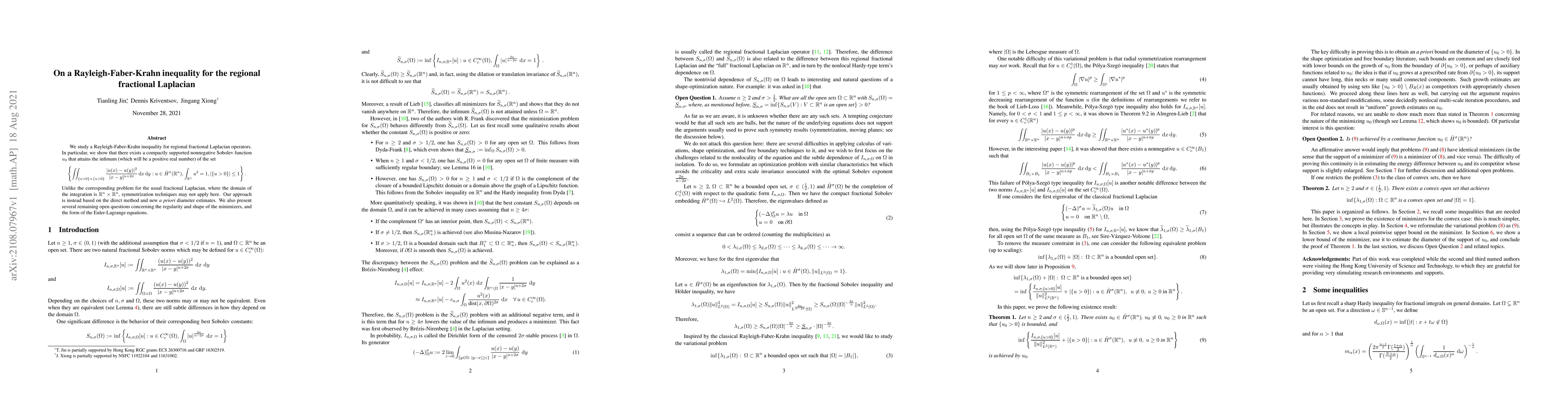We study a Rayleigh-Faber-Krahn inequality for regional fractional Laplacian operators. In particular, we show that there exists a compactly supported nonnegative Sobolev function $u_0$ that attains the infimum (which will be a positive real number) of the set \[ \left\{ \int\int_{\{u > 0\}\times\{u>0\}} \frac{|u(x) - u(y)|^2}{|x - y|^{n + 2 \sigma}}d x d y : u \in \mathring H^\sigma(\mathbb{R}^n), \int_{\mathbb{R}^n} u^2 = 1, |\{u > 0 \}| \leq 1\right\}. \] Unlike the corresponding problem for the usual fractional Laplacian, where the domain of the integration is $\mathbb{R}^n \times \mathbb{R}^n$, symmetrization techniques may not apply here. Our approach is instead based on the direct method and new a priori diameter estimates. We also present several remaining open questions concerning the regularity and shape of the minimizers, and the form of the Euler-Lagrange equations.