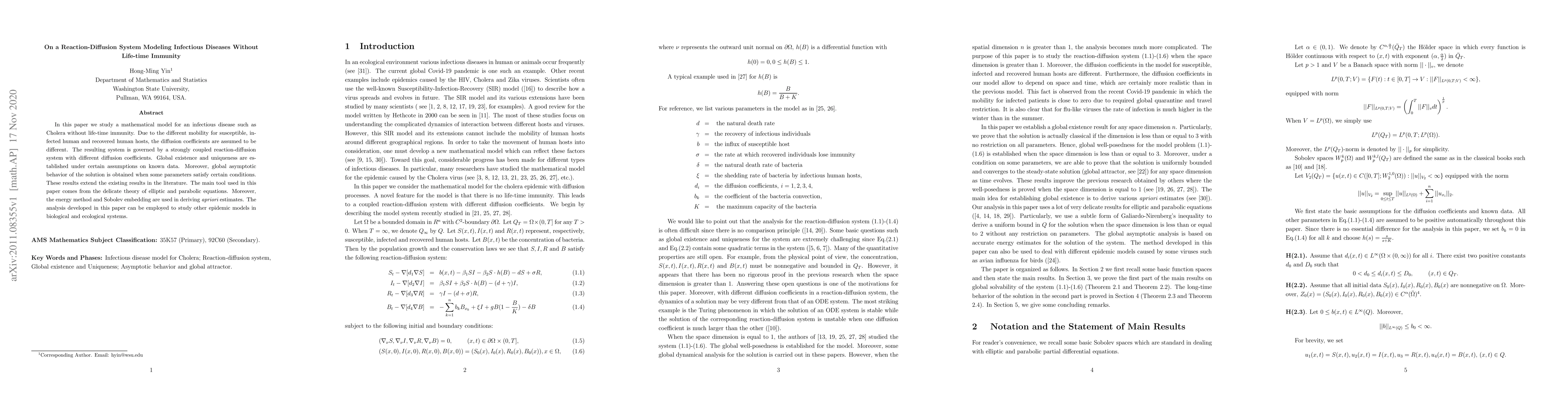This paper develops a mathematical model for infectious diseases like Cholera without lifetime immunity, establishing global existence and uniqueness of solutions under certain assumptions. It also shows that the solution exhibits global asymptotic behavior when parameters satisfy specific conditions.