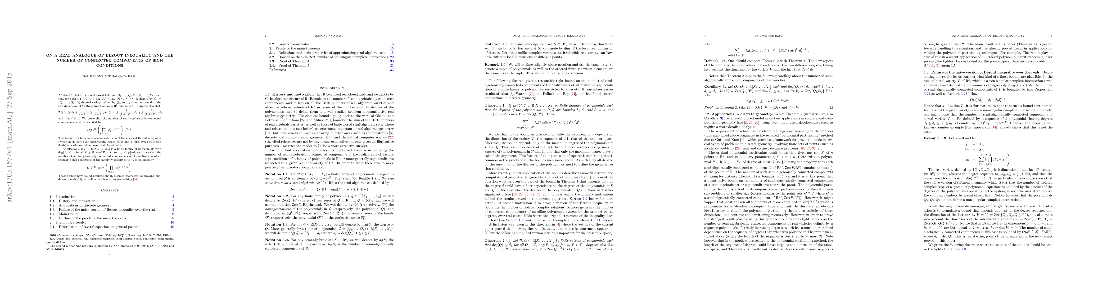 Let $\mathrm{R}$ be a real closed field and $Q_1, \ldots, Q_{\ell} \in \mathrm{R}[X_1, \ldots,X_k]$ such that for each $i, 1 \leq i \leq \ell$, $\mathrm{deg} (Q_i) \leq d_i$. For $1 \leq i \leq \ell$, denote by $\mathcal{Q}_i = \{Q_1, \ldots, Q_i \}$, $V_i$ the real variety defined by $\mathcal{Q}_i$, and $k_i$ an upper bound on the real dimension of $V_i$ (by convention $V_0 = \mathrm{R}^k$ and $k_0 = k$). Suppose also that \[ 2 \leq d_1 \leq d_2 \leq \frac{1}{k + 1} d_3 \leq \frac{1}{(k + 1)^2} d_4 \leq \cdots \leq \frac{1}{(k + 1)^{\ell - 3}} d_{\ell - 1} \leq \frac{1}{(k + 1)^{\ell - 2}} d_{\ell}, \] and that $\ell \leq k$. We prove that the number of semi-algebraically connected components of $V_{\ell}$ is bounded by \[ O (k)^{2 k} \left(\prod_{1 \leq j < \ell} d_j^{k_{j - 1} - k_j} \right) d_{\ell}^{k_{\ell - 1}}. \] This bound can be seen as a weak extension of the classical Bezout inequality (which holds only over algebraically closed fields and is false over real closed fields) to varieties defined over real closed fields. Additionally, if $\mathcal{P} \subset \mathrm{R}[X_1, \ldots, X_k]$ is a finite family of polynomials with $\mathrm{deg} (P) \leq d$ for all $P \in \mathcal{P}$, $\mathrm{card}( \mathcal{P}) = s$, and $d_{\ell} \leq \frac{1}{k + 1} d$, we prove that the number of semi-algebraically connected components of the realizations of all realizable sign conditions of the family $\mathcal{P}$ restricted to $V_{\ell}$ is bounded by \[ O (k)^{2 k} (s d)^{k_{\ell}} \left(\prod_{1 \leq j \leq \ell} d_j^{k_{j - 1} - k_j} \right). \]