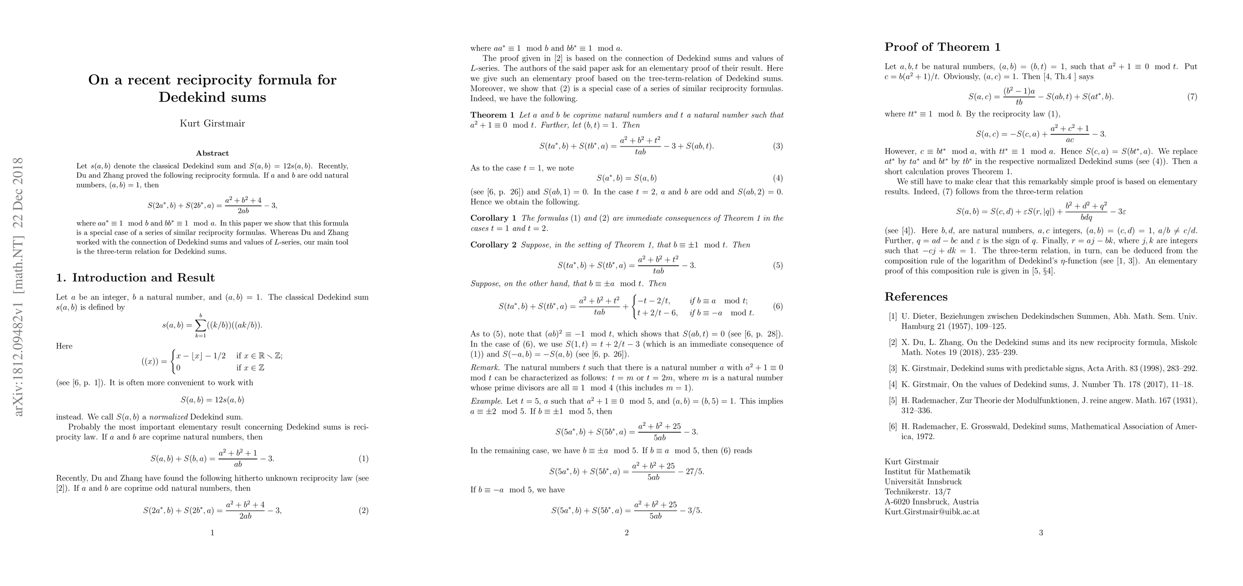 Title: On a recent reciprocity formula for Dedekind sums Summary: The paper extends Du and Zhang's reciprocity formula for Dedekind sums, showing it is a special case of a broader series of formulas derived using the three-term relation for Dedekind sums rather than $L$-series connections.