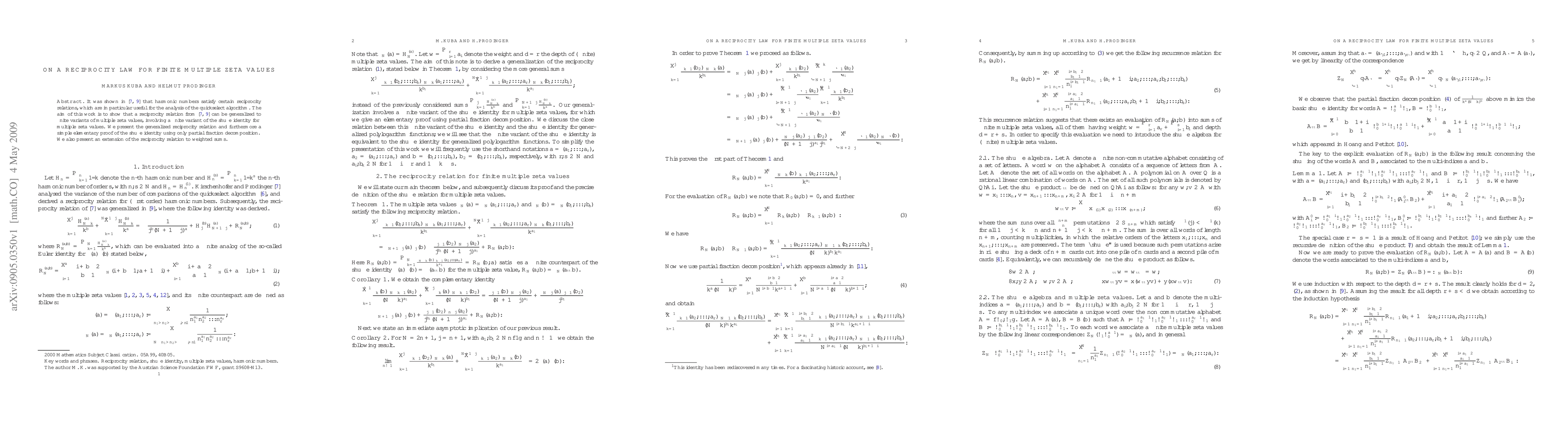 It was shown in that harmonic numbers satisfy certain reciprocity relations, which are in particular useful for the analysis of the quickselect algorithm. The aim of this work is to show that a reciprocity relation from \cite{KirProd98,ProSchnKu} can be generalized to finite variants of multiple zeta values, involving a finite variant of the shuffle identity for multiple zeta values. We present the generalized reciprocity relation and furthermore a simple elementary proof of the shuffle identity using only partial fraction decomposition. We also present an extension of the reciprocity relation to weighted sums.