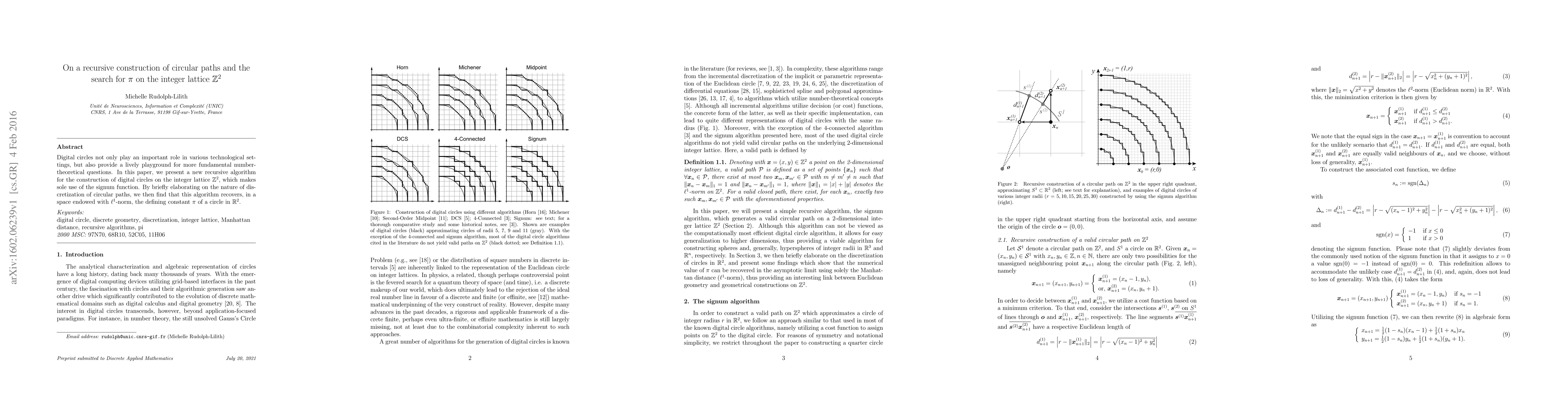 A new recursive algorithm is presented to construct digital circles on the integer lattice, which uses only the signum function and recovers the constant pi of a circle in R^2 with a space endowed with l^1-norm.