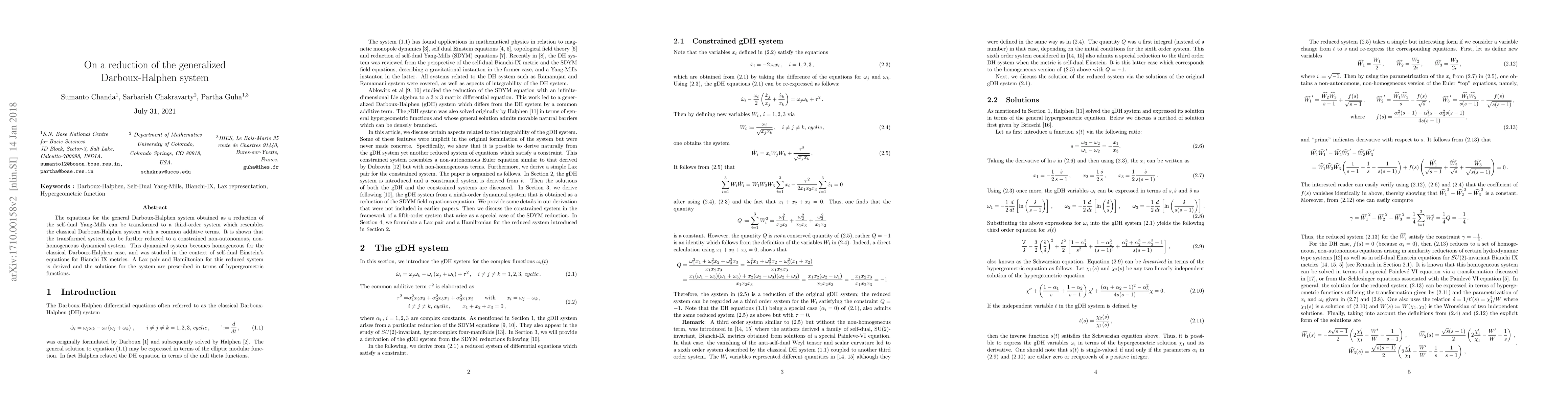 The paper reduces the generalized Darboux-Halphen system from self-dual Yang-Mills to a third-order system, further transforming it into a constrained dynamical system. A Lax pair and Hamiltonian are derived, and solutions are expressed using hypergeometric functions.