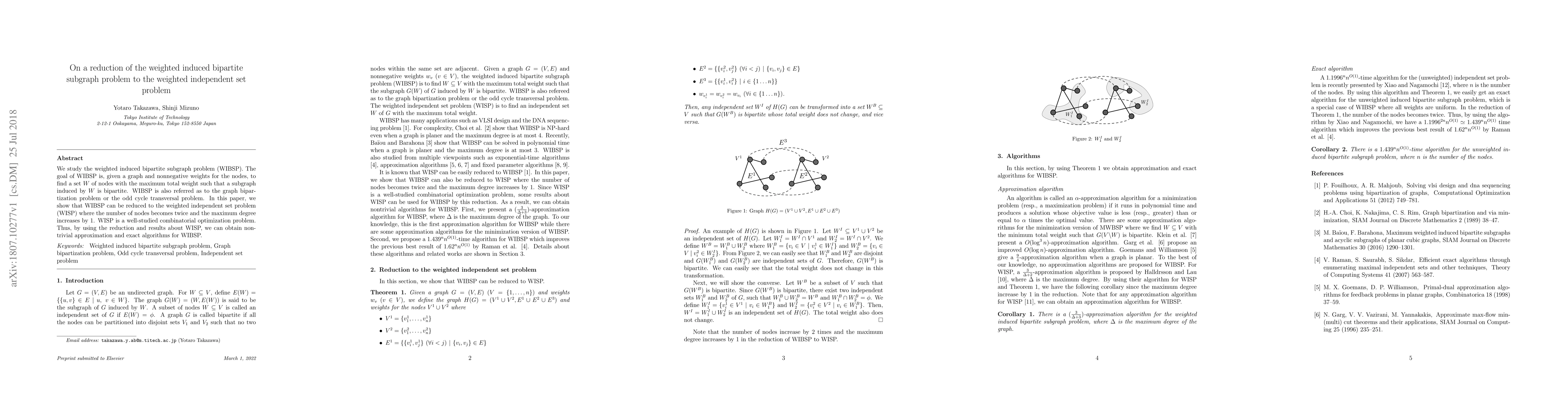 This paper demonstrates that the weighted induced bipartite subgraph problem (WIBSP) can be reduced to the weighted independent set problem (WISP), allowing the application of existing WISP algorithms to develop approximation and exact solutions for WIBSP. The reduction doubles the number of nodes and increases the maximum degree by 1.