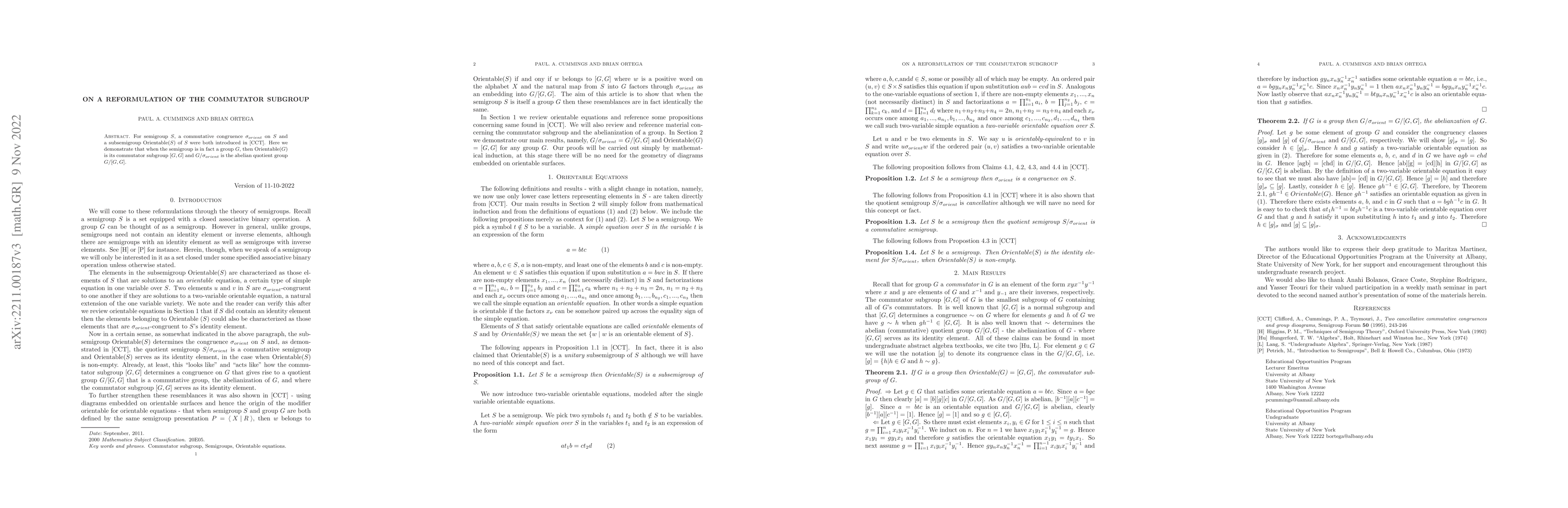 This paper reformulates the commutator subgroup of a group $G$ by showing that the subsemigroup Orientable($G$) is equivalent to $[G,G]$, and that $G / \sigma_{orient}$ corresponds to the abelian quotient group $G / [G,G]$.