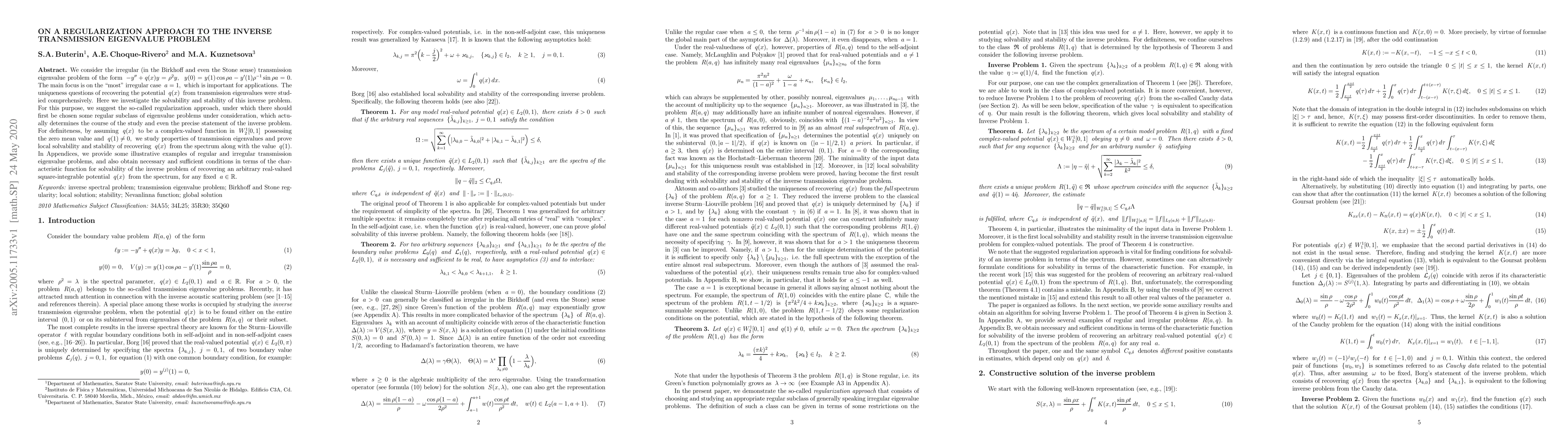 We consider the irregular (in the Birkhoff and even the Stone sense) transmission eigenvalue problem of the form $-y''+q(x)y=\rho^2 y,$ $y(0)=y(1)\cos\rho a-y'(1)\rho^{-1}\sin\rho a=0.$ The main focus is on the ''most'' irregular case $a=1,$ which is important for applications. The uniqueness questions of recovering the potential $q(x)$ from transmission eigenvalues were studied comprehensively. Here we investigate the solvability and stability of this inverse problem. For this purpose, we suggest the so-called regularization approach, under which there should first be chosen some regular subclass of eigenvalue problems under consideration, which actually determines the course of the study and even the precise statement of the inverse problem. For definiteness, by assuming $q(x)$ to be a complex-valued function in $W_2^1[0,1]$ possessing the zero mean value and $q(1)\ne0,$ we study properties of transmission eigenvalues and prove local solvability and stability of recovering $q(x)$ from the spectrum along with the value $q(1).$ In Appendices, we provide some illustrative examples of regular and irregular transmission eigenvalue problems, and also obtain necessary and sufficient conditions in terms of the characteristic function for solvability of the inverse problem of recovering an arbitrary real-valued square-integrable potential $q(x)$ from the spectrum, for any fixed $a\in{\mathbb R}.$