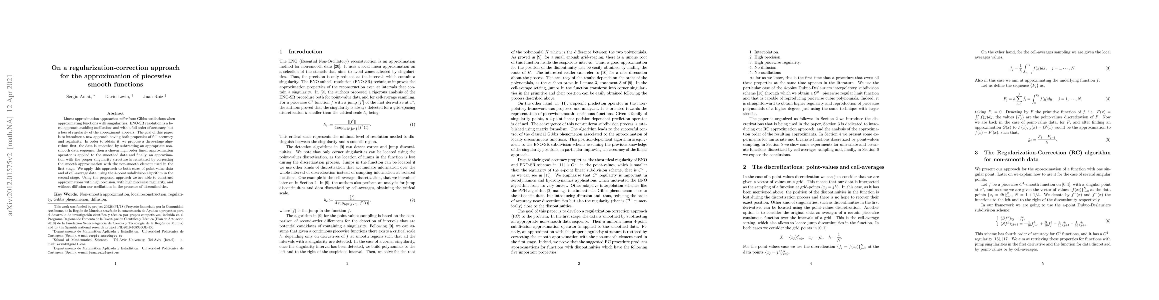 Linear approximation approaches suffer from Gibbs oscillations when approximating functions with singularities. ENO-SR resolution is a local approach avoiding oscillations and with a full order of accuracy, but a loss of regularity of the approximant appears. The goal of this paper is to introduce a new approach having both properties of full accuracy and regularity. In order to obtain it, we propose a three-stage algorithm: first, the data is smoothed by subtracting an appropriate non-smooth data sequence; then a chosen high order linear approximation operator is applied to the smoothed data and finally, an approximation with the proper singularity structure is reinstated by correcting the smooth approximation with the non-smooth element used in the first stage. We apply this approach to both cases of point-value data and of cell-average data, using the 4-point subdivision algorithm in the second stage. Using the proposed approach we are able to construct approximations with high precision, with high piecewise regularity, and without diffusion nor oscillations in the presence of discontinuities.