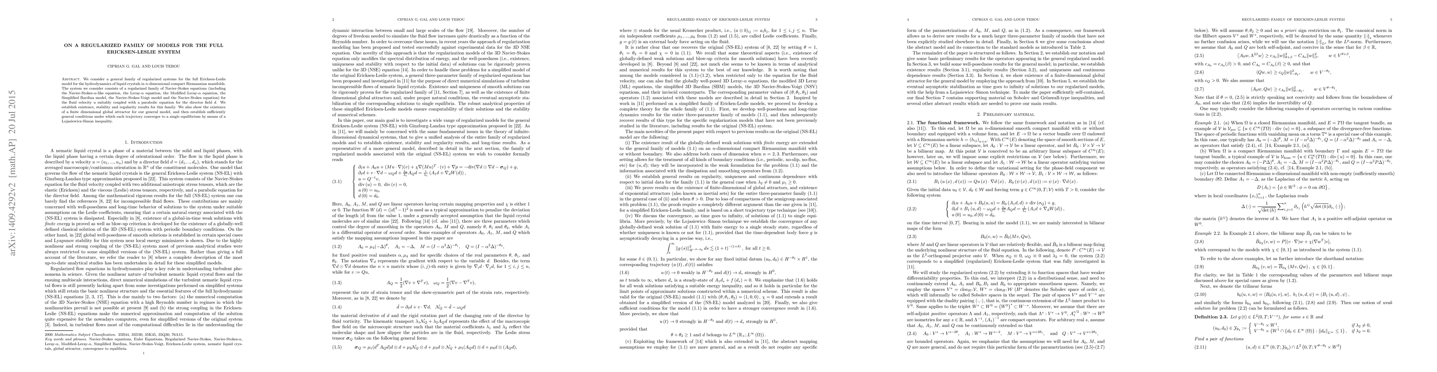 We consider a general family of regularized systems for the full Ericksen-Leslie model for the hydrodynamics of liquid crystals in $n$-dimensional compact Riemannian manifolds, $n$=2,3. The system we consider consists of a regularized family of Navier-Stokes equations (including the Navier Stokes-$\alpha $-like equation, the Leray-$\alpha $ equation, the Modified Leray-$\alpha $ equation, the Simplified Bardina model, the Navier Stokes-Voigt model and the Navier-Stokes equation) for the fluid velocity $u$ suitably coupled with a parabolic equation for the director field $d$. We establish existence, stability and regularity results for this family. We also show the existence of a finite dimensional global attractor for our general model, and then establish sufficiently general conditions under which each trajectory converges to a single equilibrium by means of a Lojasiewicz-Simon inequality.
