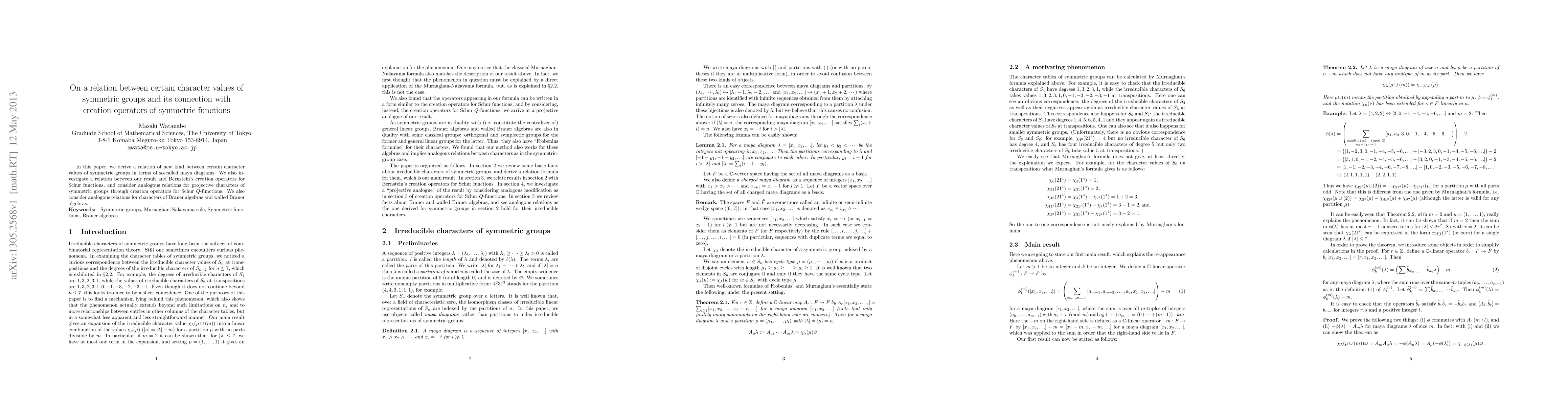 In this paper, we derive a relation of new kind between certain character values of symmetric groups in terms of so-called maya diagrams. We also investigate a relation between our result and Bernstein's creation operators for Schur functions, and consider analogous relations for projective characters of symmetric groups through creation operators for Schur $Q$-functions. We also consider analogous relations for characters of Brauer algebras and walled Brauer algebras.