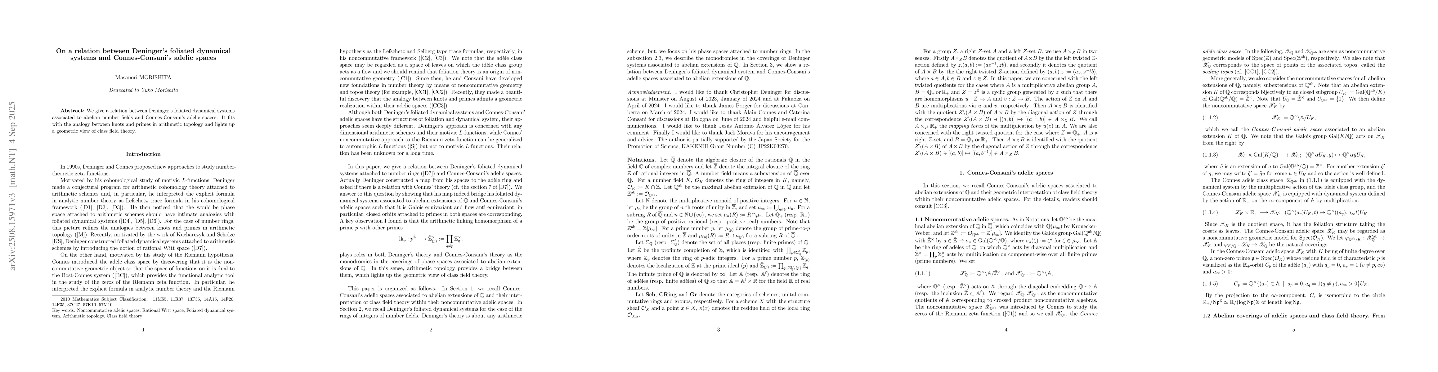 We give a relation between Deninger's foliated dynamical systems associated to abelian number fields and Connes-Consani's adelic spaces. It fits with the analogy between knots and primes in arithmetic topology and lights up a geometric view of class field theory.