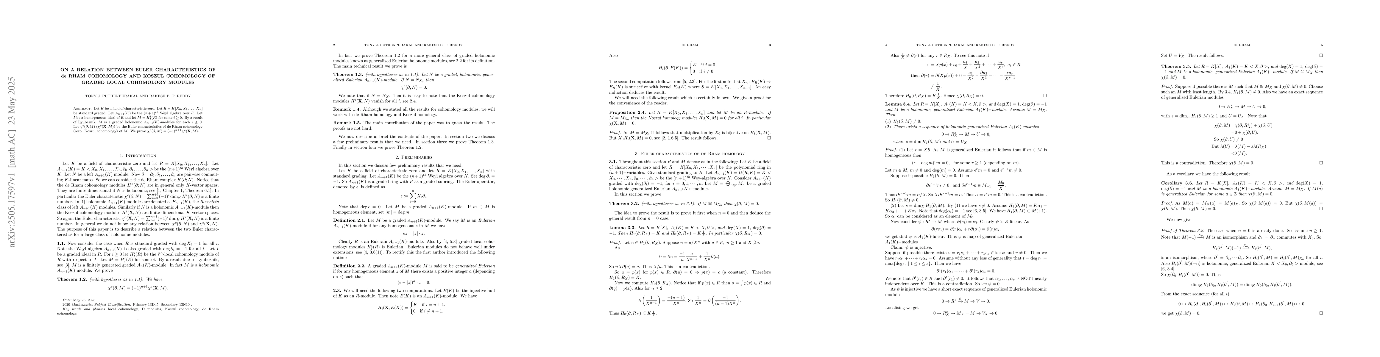 The paper establishes a relation between Euler characteristics of de Rham cohomology and Koszul cohomology of graded local cohomology modules, utilizing properties of holonomic modules over Weyl algebras.