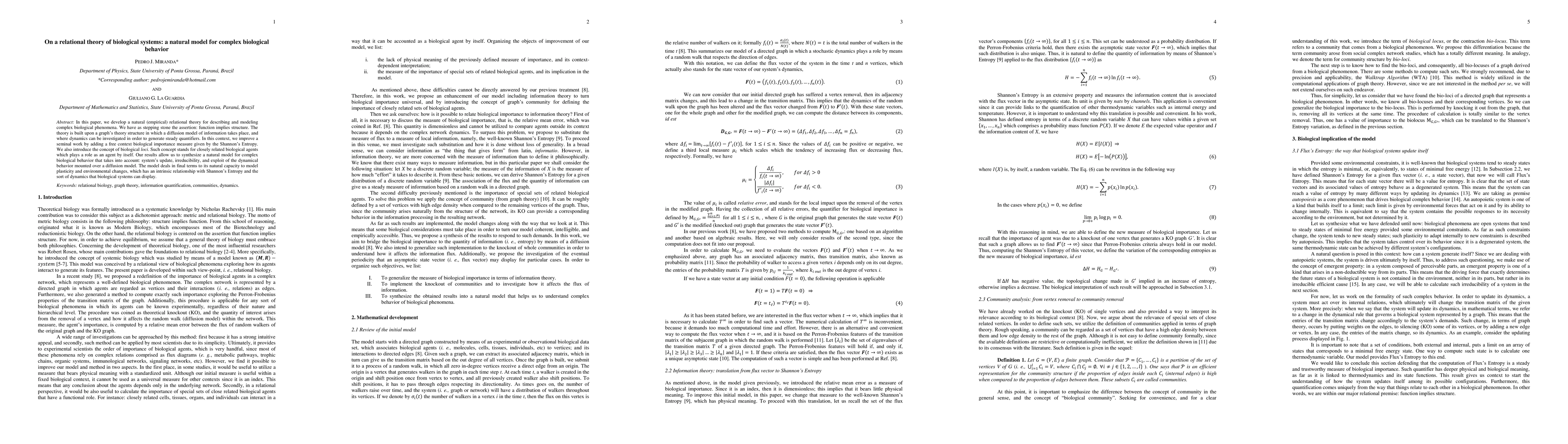In this paper, we develop a natural (empirical) relational theory for describing and modeling complex biological phenomena. We have as stepping stone the assertion: function implies structure. The theory is built upon a graph's theory structure in which a diffusion model of information takes place, and where dynamics can be investigated in order to generate steady quantifiers. In this context, we improve a seminal work by adding a free context biological importance measure given by the Shannon's Entropy. We also introduce the concept of biological loci. Such concept stands for closely related biological agents which plays a role as an agent by itself. Our results allow us to synthesize a natural model for complex biological behavior that takes into account: system's update, irreducibility, and exploit of the dynamical behavior mounted over a diffusion model. The model deals in final terms to its natural capacity to model plasticity and environmental changes, which has an intrinsic relationship with Shannon's Entropy and the sort of dynamics that biological systems can display.