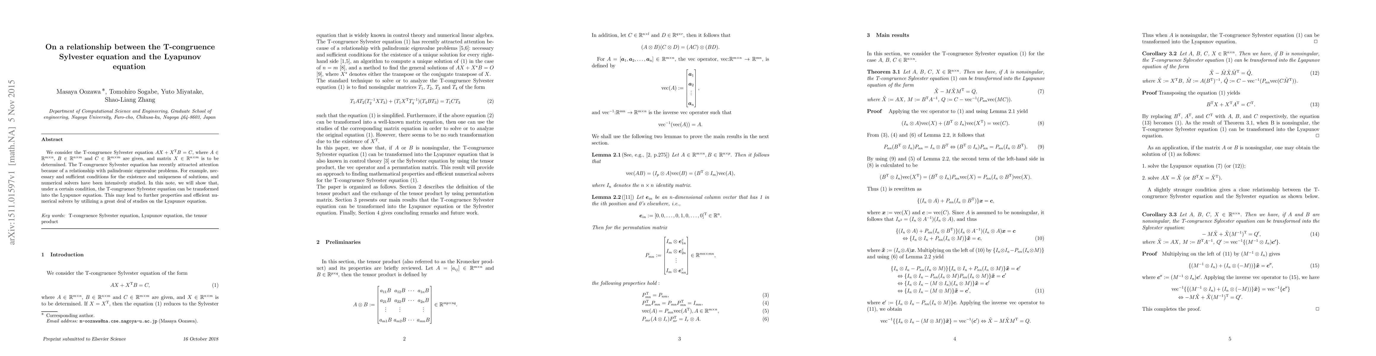 This paper explores the transformation of the T-congruence Sylvester equation into the Lyapunov equation under specific conditions, potentially leveraging existing studies on the Lyapunov equation for enhanced properties and numerical solutions.