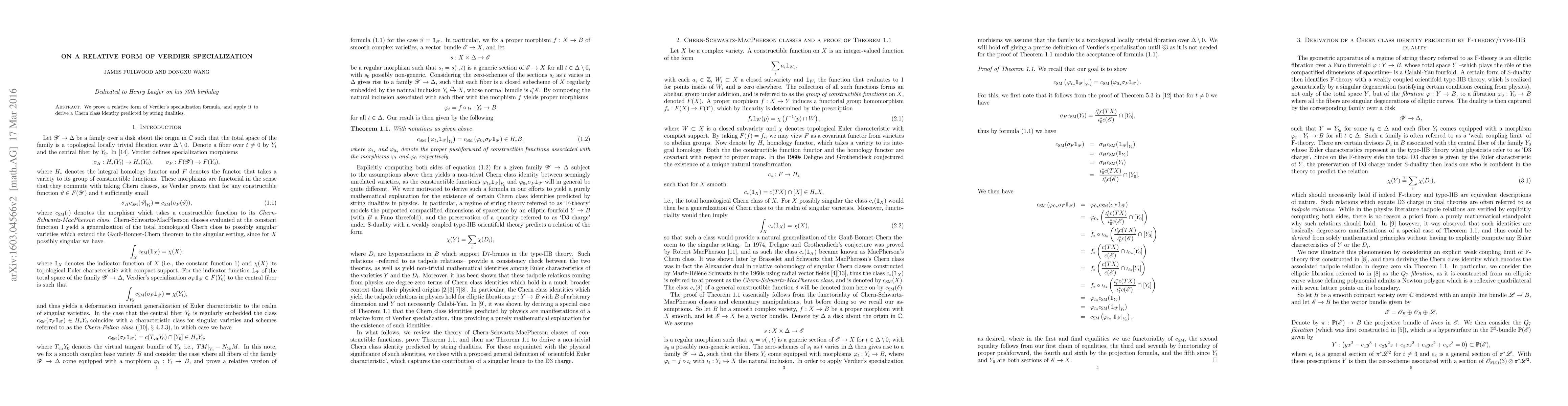 Researchers prove a relative form of Verdier specialization formula to derive a Chern class identity from string dualities, advancing understanding in algebraic geometry.