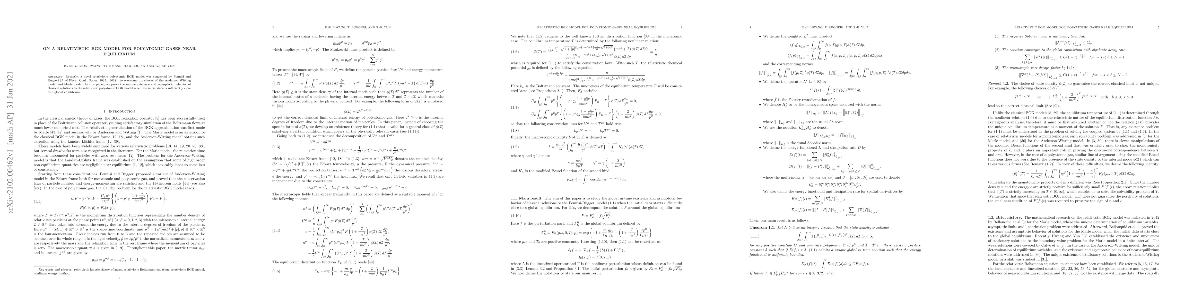 This paper proves the unique existence and establishes the asymptotic behavior of classical solutions for a newly proposed relativistic polyatomic BGK model, addressing limitations of previous models like Anderson-Witting and Marle. The solutions are shown to hold when initial data are close to global equilibrium.