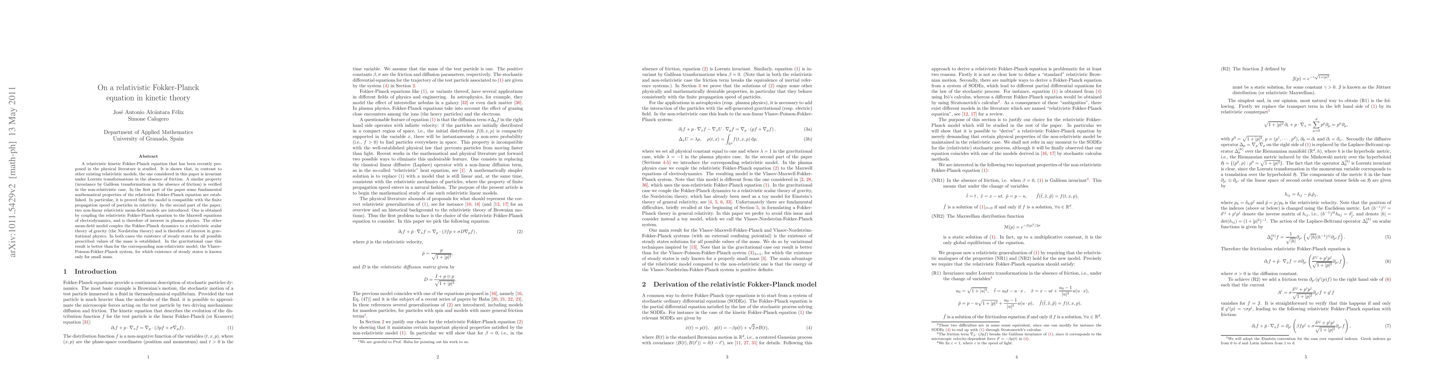 This paper investigates a relativistic Fokker-Planck equation, proving its invariance under Lorentz transformations and its compatibility with finite particle propagation speeds. It introduces two relativistic mean-field models, one for plasma physics and another for gravitational physics, establishing the existence of steady states for all mass values in the gravitational case.