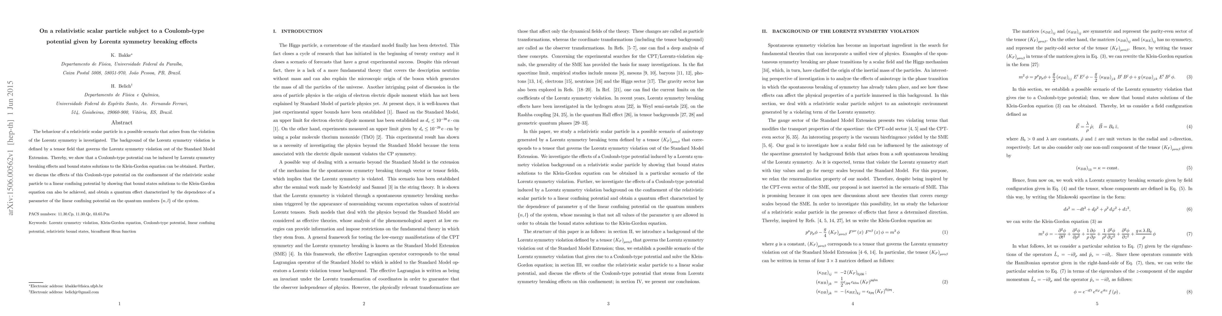 This paper investigates the behavior of a relativistic scalar particle under Lorentz symmetry violation, showing that it induces a Coulomb-type potential. The study demonstrates that bound states solutions to the Klein-Gordon equation can be obtained, revealing a quantum effect where the parameter of a linear confining potential depends on the quantum numbers of the system.