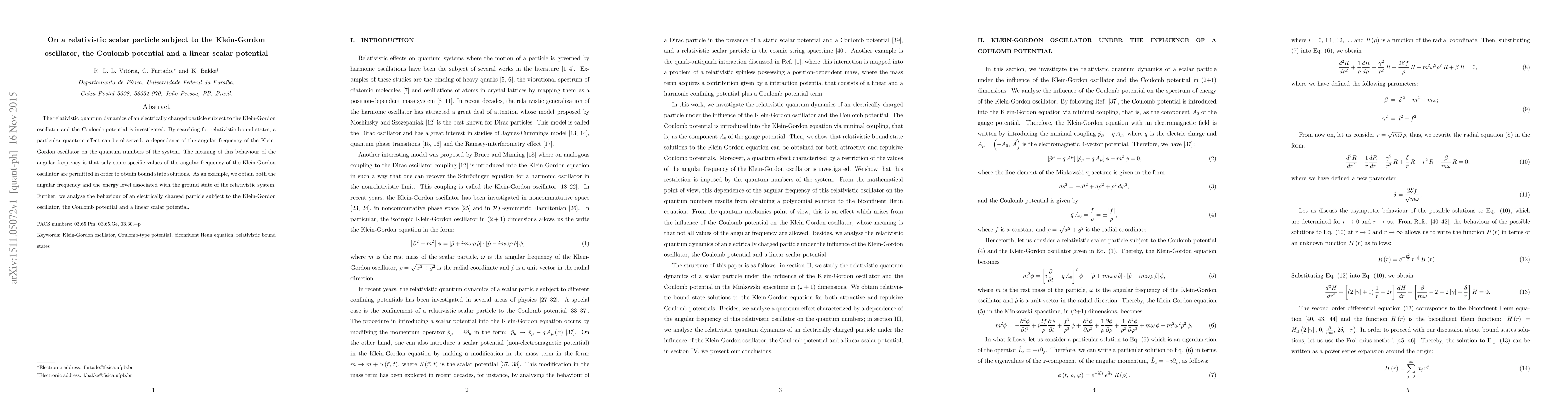 This paper investigates the relativistic quantum dynamics of a charged particle under the Klein-Gordon oscillator, Coulomb potential, and a linear scalar potential, revealing a dependence of the Klein-Gordon oscillator's angular frequency on quantum numbers, permitting only specific frequencies for bound state solutions. The study also analyzes the energy levels of the ground state and the behavior of the particle under these potentials.