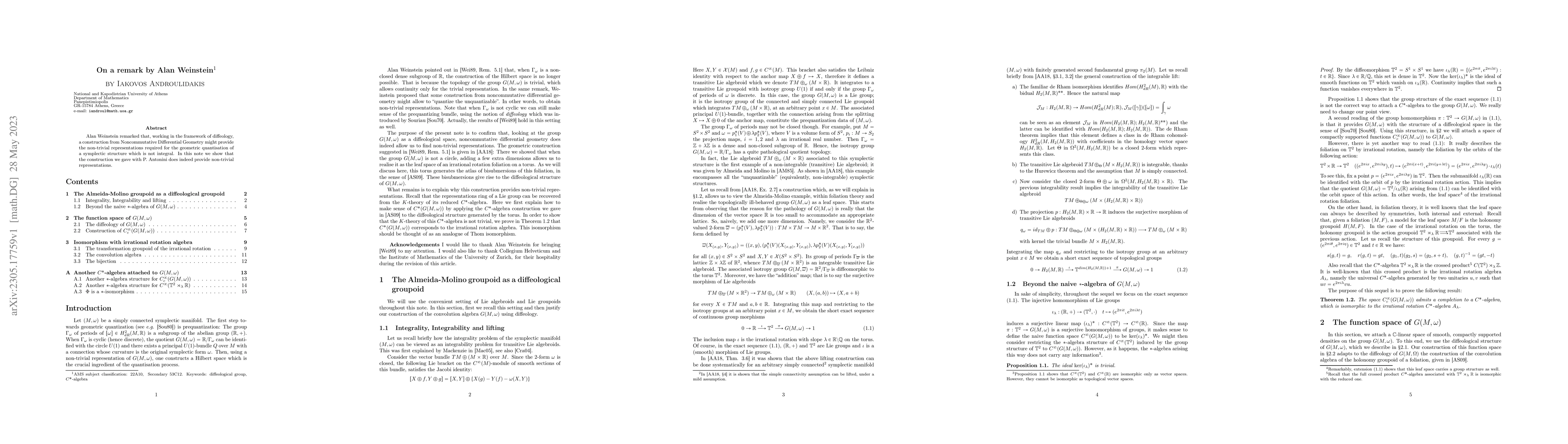 Alan Weinstein remarked that, working in the framework of diffeology, a construction from Noncommutative Differential Geometry might provide the non-trivial representations required for the geometric quantisation of a symplectic structure which is not integral. In this note we show that the construction we gave with P. Antonini does indeed provide non-trivial representations.