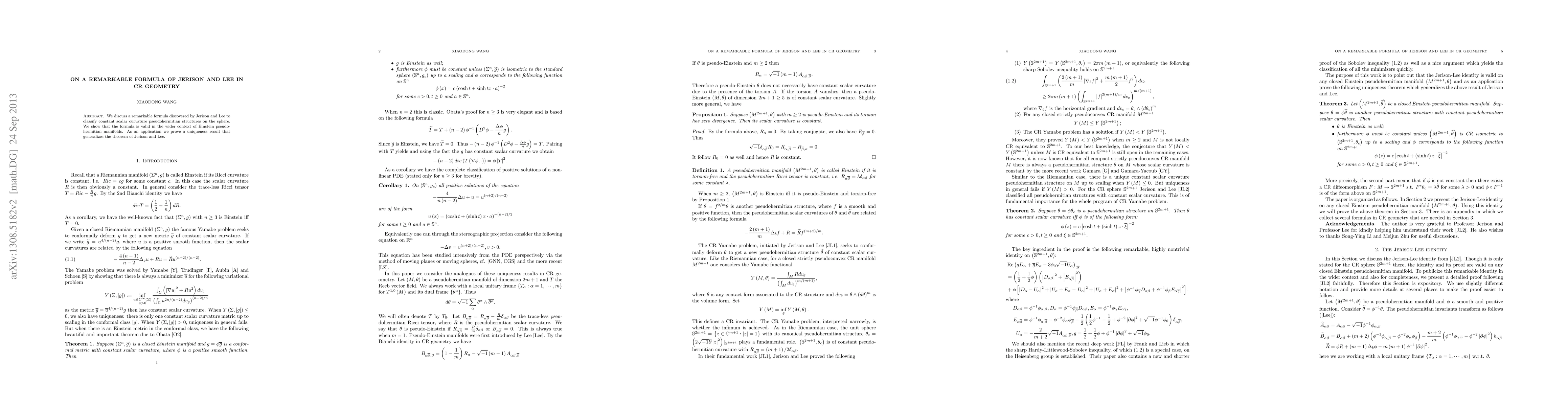 This paper proves a remarkable formula from Jerison and Lee for classifying constant scalar curvature pseudohermitian structures on the sphere, extending it to Einstein pseudohermitian manifolds and proving a uniqueness result.