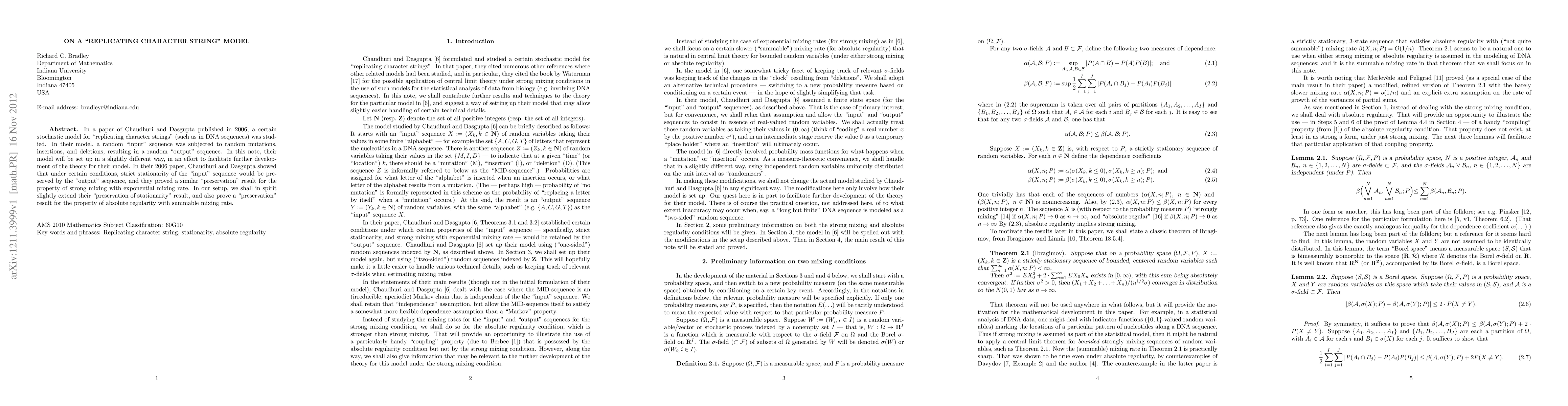 In a paper of Chaudhuri and Dasgupta published in 2006, a certain stochastic model for "replicating character strings" (such as in DNA sequences) was studied. In their model, a random "input" sequence was subjected to random mutations, insertions, and deletions, resulting in a random "output" sequence. In this note, their model will be set up in a slightly different way, in an effort to facilitate further development of the theory for their model. In their 2006 paper, Chaudhuri and Dasgupta showed that under certain conditions, strict stationarity of the "input" sequence would be preserved by the "output" sequence, and they proved a similar "preservation" result for the property of strong mixing with exponential mixing rate. In our setup, we shall in spirit slightly extend their "preservation of stationarity" result, and also prove a "preservation" result for the property of absolute regularity with summable mixing rate.