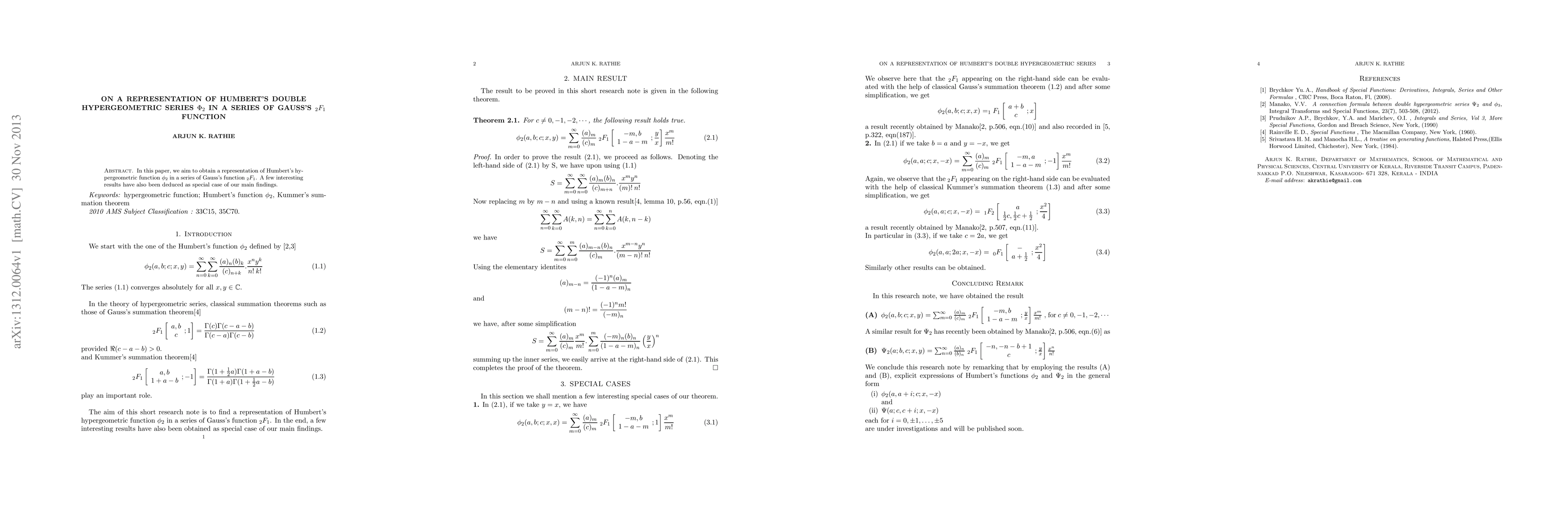 Summary: This paper presents a representation of Humbert's double hypergeometric series in terms of Gauss's 2F1 function, along with several interesting special cases derived from the main findings.
