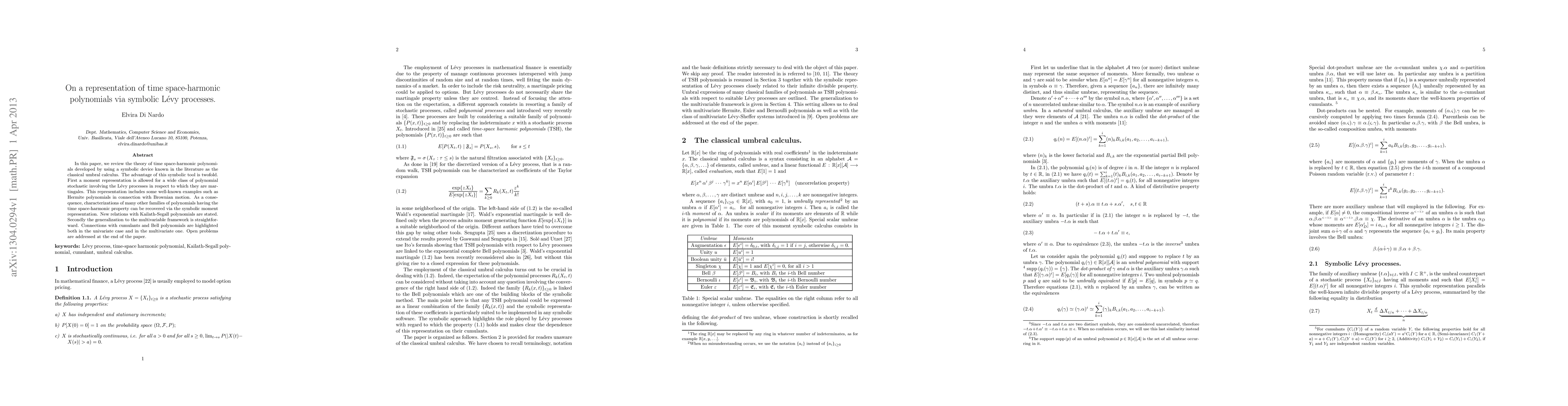In this paper, we review the theory of time space-harmonic polynomials developed by using a symbolic device known in the literature as the classical umbral calculus. The advantage of this symbolic tool is twofold. First a moment representation is allowed for a wide class of polynomial stochastic involving the L\'evy processes in respect to which they are martingales. This representation includes some well-known examples such as Hermite polynomials in connection with Brownian motion. As a consequence, characterizations of many other families of polynomials having the time space-harmonic property can be recovered via the symbolic moment representation. New relations with Kailath-Segall polynomials are stated. Secondly the generalization to the multivariable framework is straightforward. Connections with cumulants and Bell polynomials are highlighted both in the univariate case and in the multivariate one. Open problems are addressed at the end of the paper.