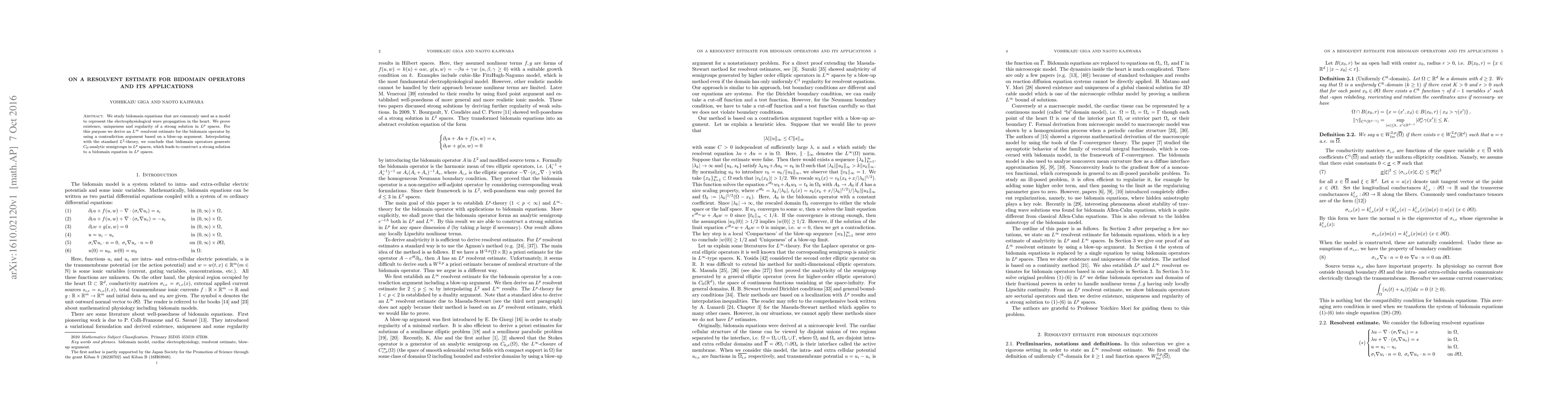 We study bidomain equations that are commonly used as a model to represent the electrophysiological wave propagation in the heart. We prove existence, uniqueness and regularity of a strong solution in $L^p$ spaces. For this purpose we derive an $L^\infty$ resolvent estimate for the bidomain operator by using a contradiction argument based on a blow-up argument. Interpolating with the standard $L^2$-theory, we conclude that bidomain operators generate $C_0$-analytic semigroups in $L^p$ spaces, which leads to construct a strong solution to a bidomain equation in $L^p$ spaces.