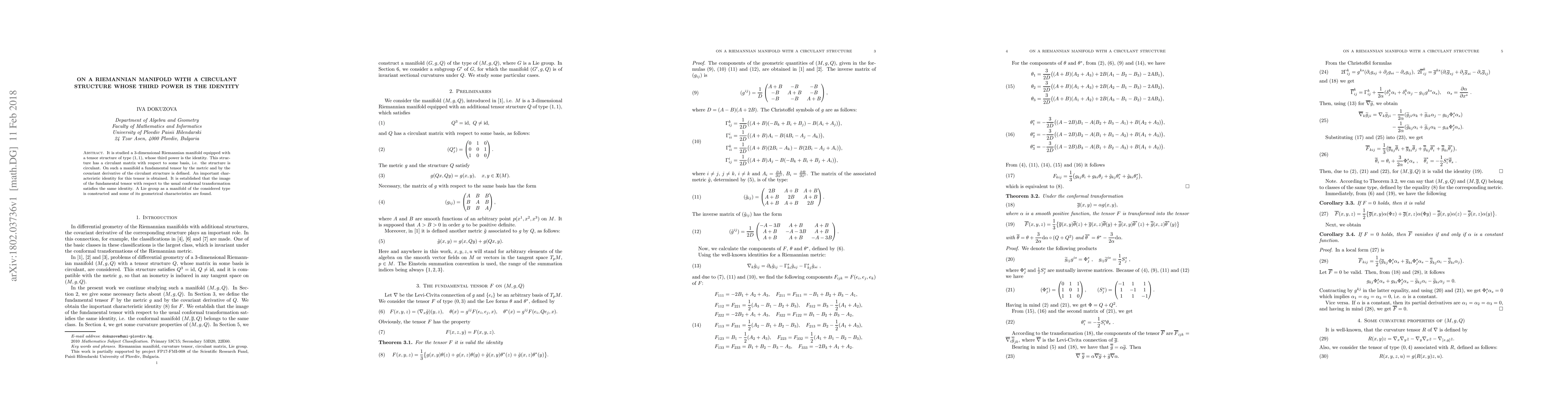 A 3D Riemannian manifold with a circulant structure whose third power is the identity is studied, leading to the construction of a Lie group and identification of its geometrical characteristics.