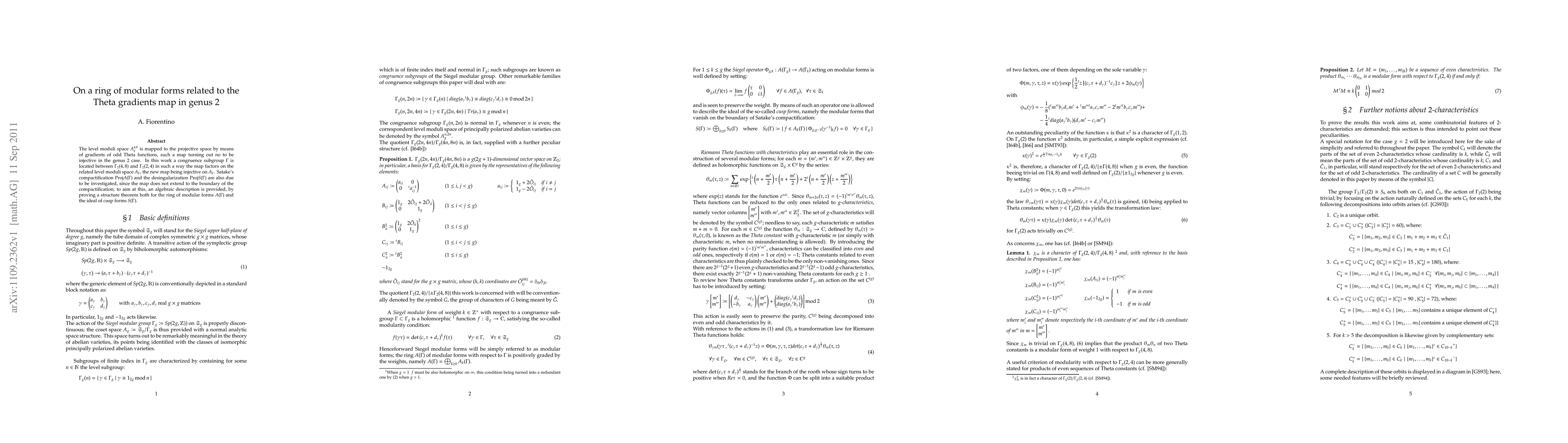 Researchers investigate a map from genus 2 level moduli spaces to projective space via Theta gradients, finding that it's not injective but can be made so with a specific congruence subgroup, leading to new insights into modular forms and their compactification.