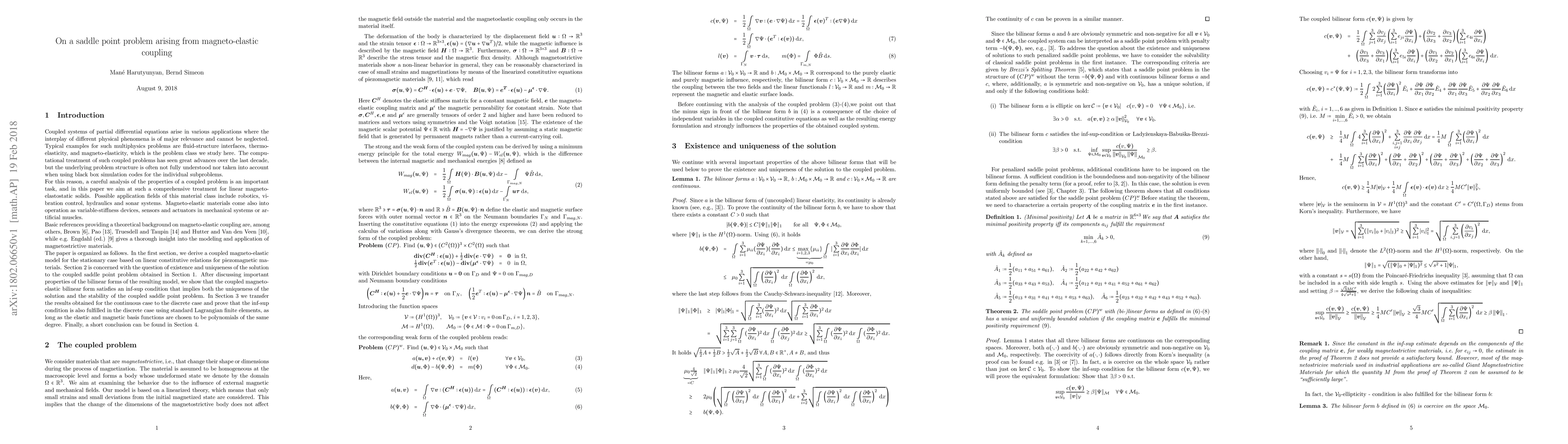 This paper analyzes a coupled magneto-elastic problem derived from linear magneto-elastostaticity, proving the existence and uniqueness of solutions for both continuous and discrete cases. It highlights the saddle point structure and demonstrates the stability of the bilinear form through an inf-sup condition.