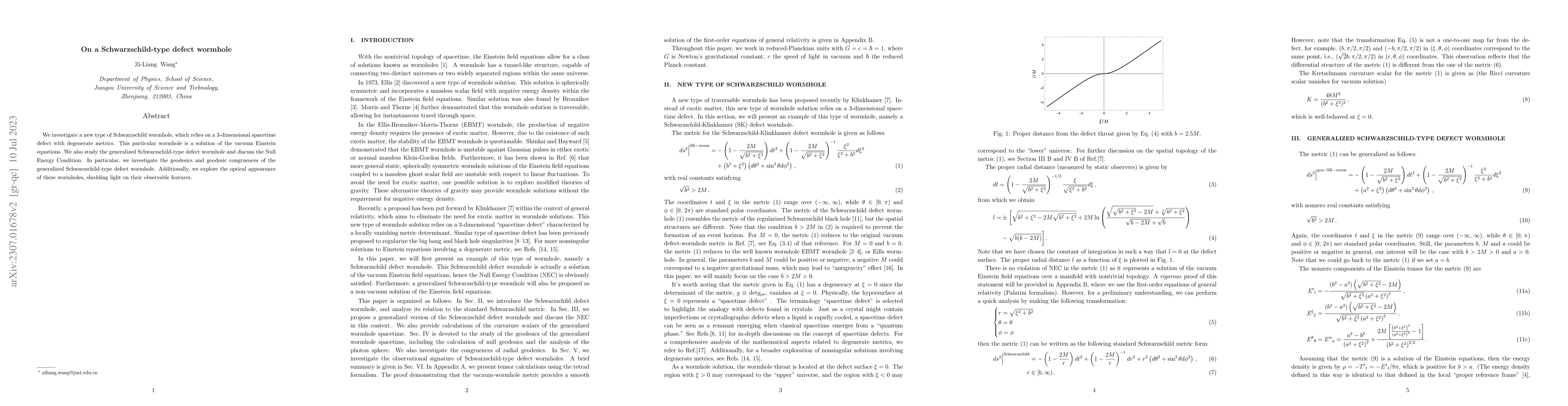 This paper explores a novel Schwarzschild wormhole based on a 3-dimensional spacetime defect, solving the vacuum Einstein equations. It examines geodesics and the Null Energy Condition, and investigates the optical appearance of these generalized defect wormholes.