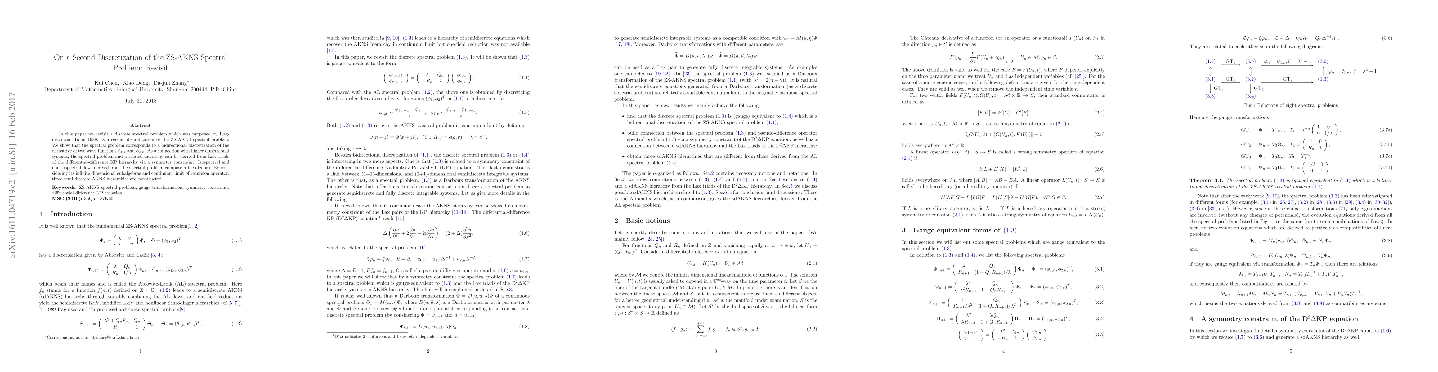In this paper we revisit a discrete spectral problem which was proposed by Ragnisco and Tu in 1989, as a second discretization of the ZS-AKNS spectral problem. We show that the spectral problem corresponds to a bidirectional discretization of the derivative of two wave functions $\phi_{1,x}$ and $\phi_{2,x}$. As a connection with higher dimensional systems, the spectral problem and a related hierarchy can be derived from Lax triads of the differential-difference KP hierarchy via a symmetry constraint. Isospectral and nonisospectral flows derived from the spectral problem compose a Lie algebra. By considering its infinite dimensional subalgebras and continuum limit of recursion operator, three semi-discrete AKNS hierarchies are constructed.