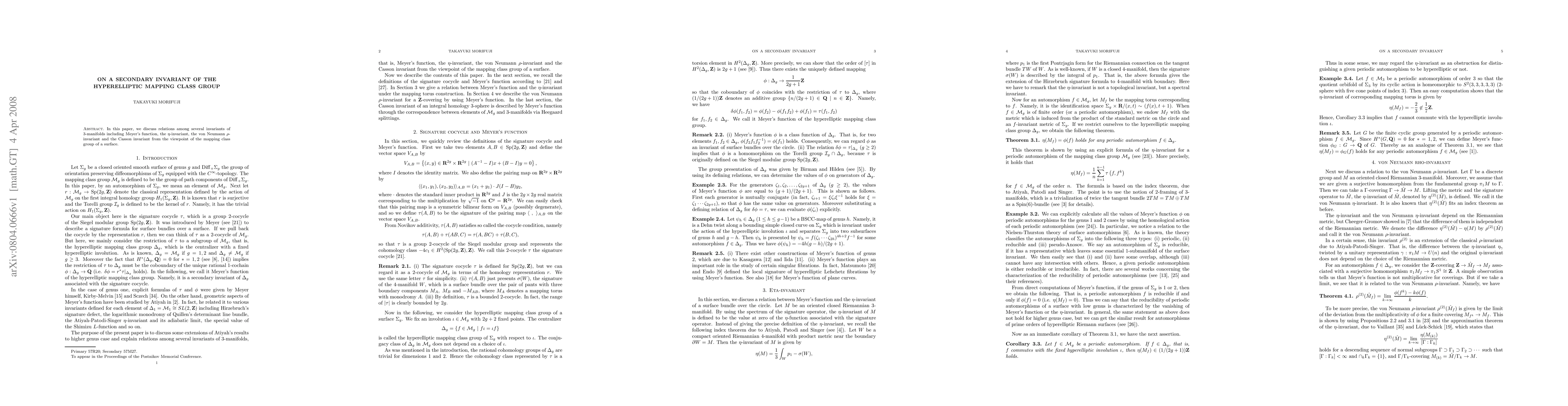 This paper explores connections between various invariants of 3-manifolds, such as Meyer's function, the eta-invariant, the von Neumann rho-invariant, and the Casson invariant, through the lens of the hyperelliptic mapping class group of a surface.