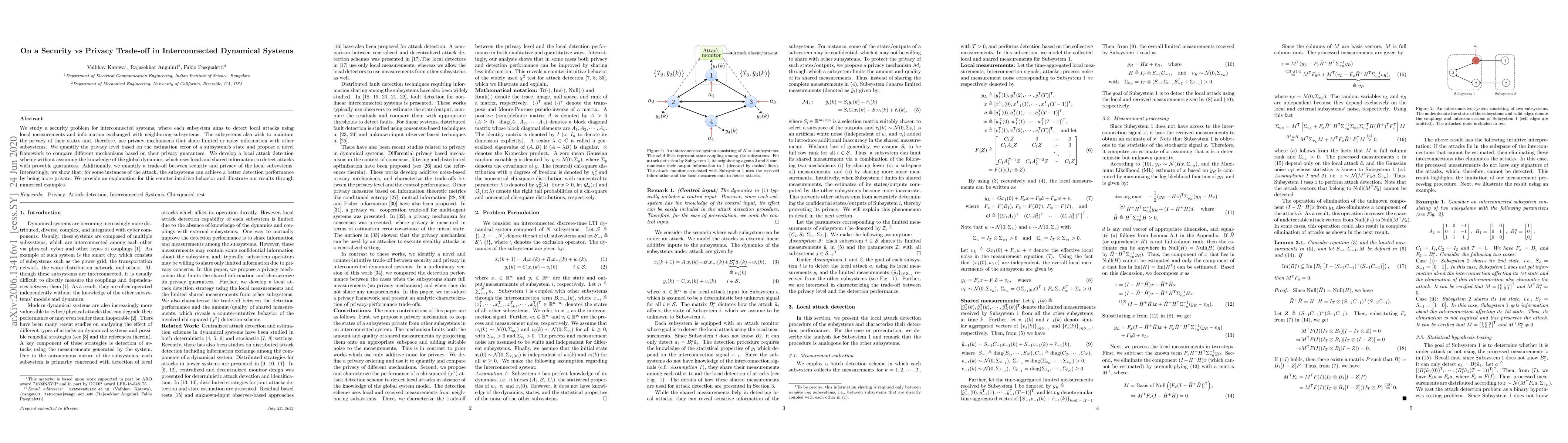 This paper investigates a security vs. privacy trade-off in interconnected dynamical systems, proposing a novel framework to evaluate privacy mechanisms based on estimation errors. It develops a local attack detection scheme that leverages local and shared information, demonstrating a counterintuitive finding where increased privacy can enhance detection performance for certain attacks, supported by numerical examples.