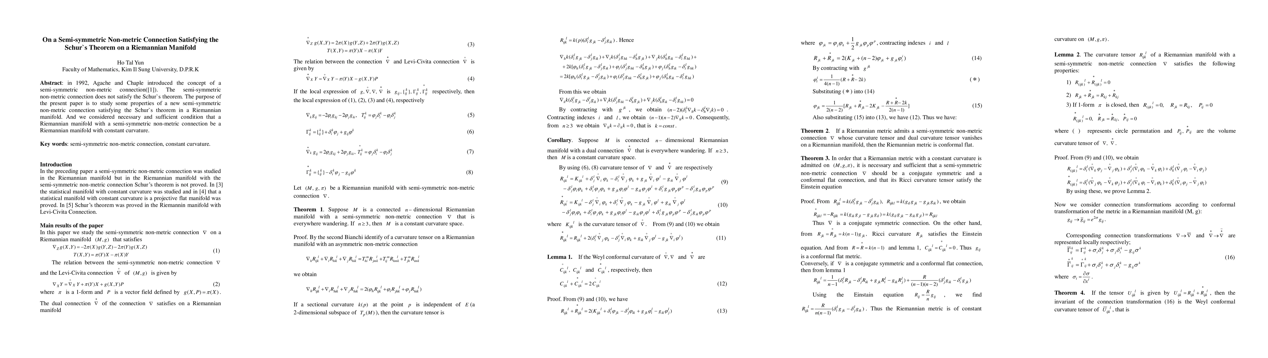 This paper explores a novel semi-symmetric non-metric connection that satisfies Schur's theorem in a Riemannian manifold, and it establishes the necessary and sufficient conditions for such a connection to result in a manifold of constant curvature.