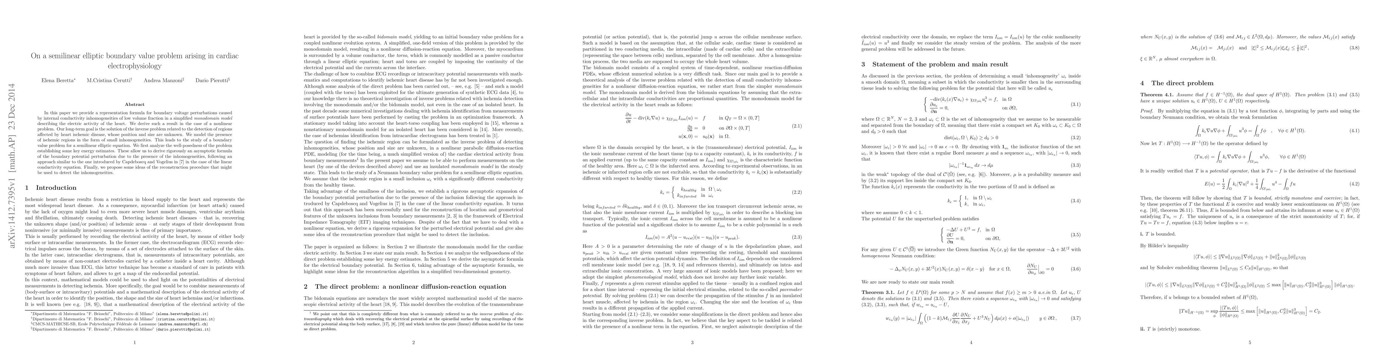 In this paper we provide a representation formula for boundary voltage perturbations caused by internal conductivity inhomogeneities of low volume fraction in a simplified {\em monodomain model} describing the electric activity of the heart. We derive such a result in the case of a nonlinear problem. Our long-term goal is the solution of the inverse problem related to the detection of regions affected by heart ischemic disease, whose position and size are unknown. We model the presence of ischemic regions in the form of small inhomogeneities. This leads to the study of a boundary value problem for a semilinear elliptic equation. We first analyze the well-posedness of the problem establishing some key energy estimates. These allow us to derive rigorously an asymptotic formula of the boundary potential perturbation due to the presence of the inhomogeneities, following an approach similar to the one introduced by Capdeboscq and Vogelius in \cite{capvoge} in the case of the linear conductivity equation. Finally, we propose some ideas of the reconstruction procedure that might be used to detect the inhomogeneities.