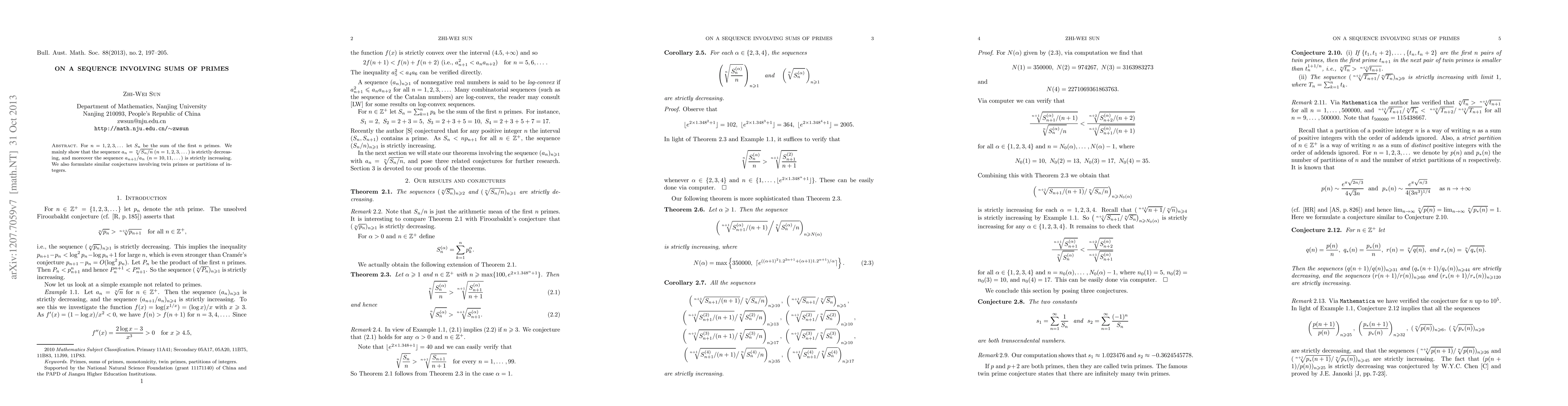The paper demonstrates that the sequence \(a_n = \sqrt[n]{S_n/n}\), where \(S_n\) is the sum of the first \(n\) primes, is strictly decreasing, and the ratio \(a_{n+1}/a_n\) for \(n \geq 10\) is strictly increasing. It also proposes conjectures regarding similar sequences involving twin primes and integer partitions.