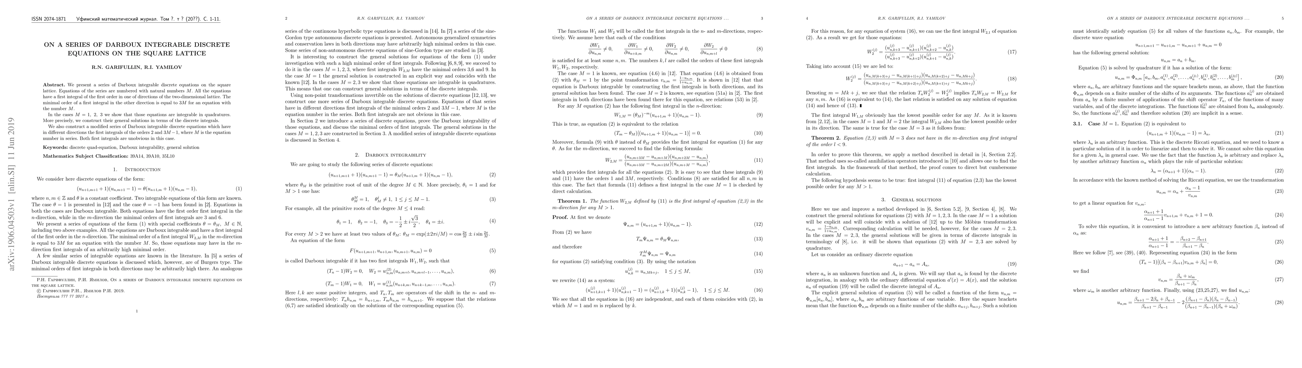 We present a series of Darboux integrable discrete equations on the square lattice. Equations of the series are numbered with natural numbers $M$. All the equations have a first integral of the first order in one of directions of the two-dimensional lattice. The minimal order of a first integral in the other direction is equal to $3M$ for an equation with the number $M$. In the cases $M=1,\ 2,\ 3$ we show that those equations are integrable in quadratures. More precisely, we construct their general solutions in terms of the discrete integrals. We also construct a modified series of Darboux integrable discrete equations which have in different directions the first integrals of the orders $2$ and $3M-1$, where $M$ is the equation number in series. Both first integrals are unobvious in this case.