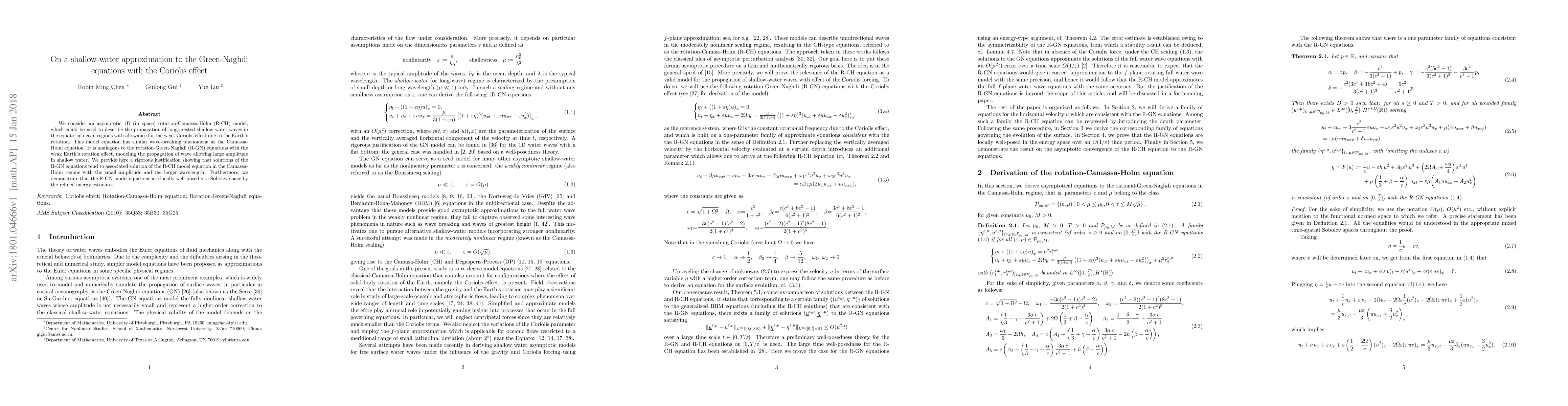 We consider an asymptotic 1D (in space) rotation-Camassa-Holm (R-CH) model, which could be used to describe the propagation of long-crested shallow-water waves in the equatorial ocean regions with allowance for the weak Coriolis effect due to the Earth's rotation. This model equation has similar wave-breaking phenomena as the Camassa-Holm equation. It is analogous to the rotation-Green-Naghdi (R-GN) equations with the weak Earth's rotation effect, modeling the propagation of wave allowing large amplitude in shallow water. We provide here a rigorous justification showing that solutions of the R-GN equations tend to associated solution of the R-CH model equation in the Camassa-Holm regime with the small amplitude and the larger wavelength. Furthermore, we demonstrate that the R-GN model equations are locally well-posed in a Sobolev space by the refined energy estimates.