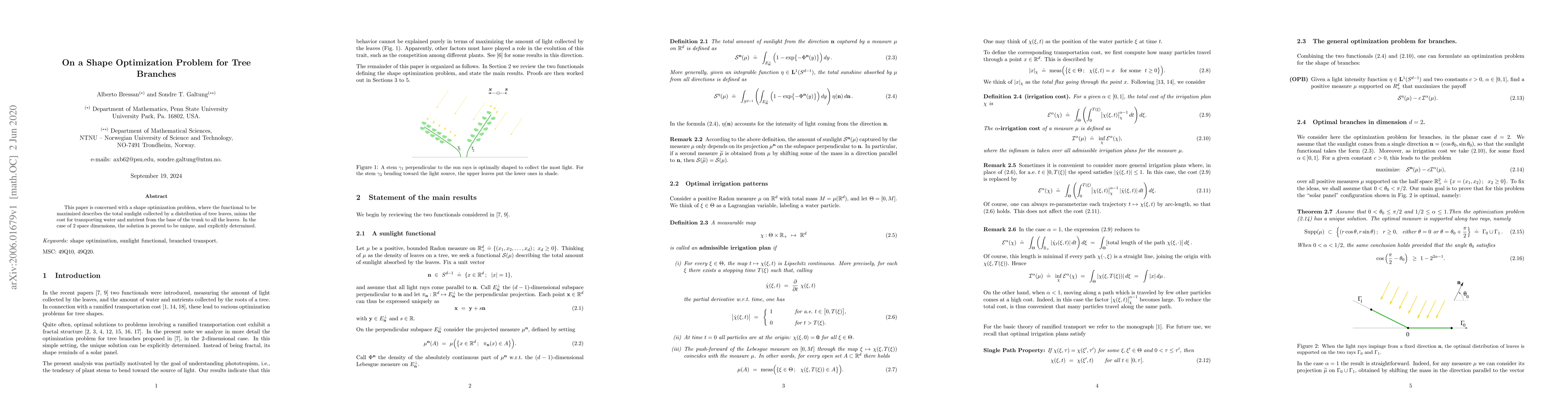 This paper solves a shape optimization problem for tree branches to maximize sunlight collection while minimizing water transport costs in 2D space, finding a unique solution.