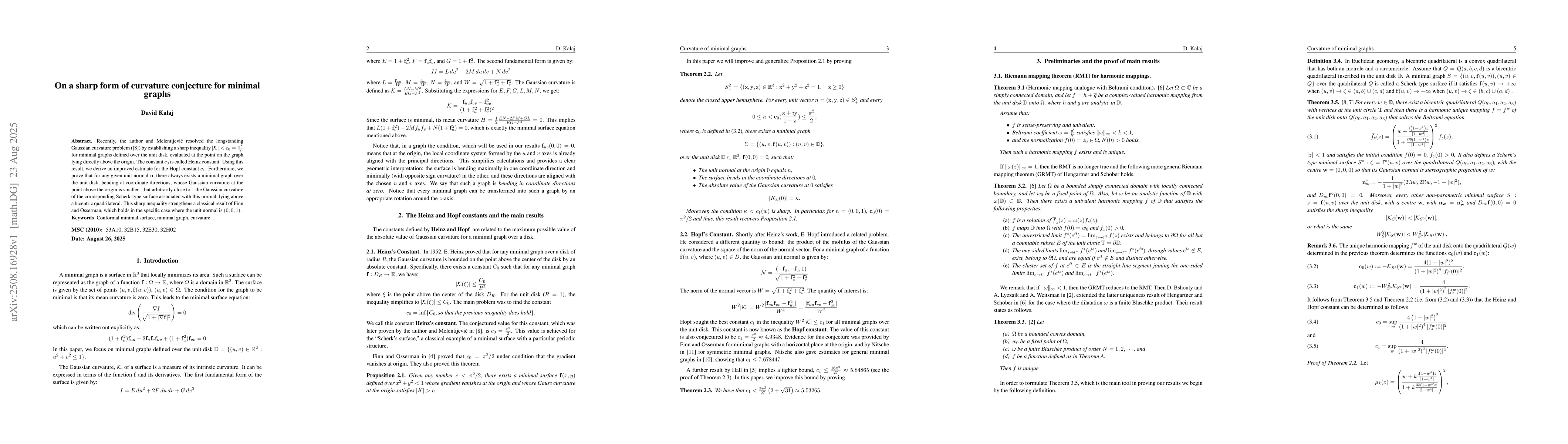 Recently, the author and Melentijevi\'c resolved the longstanding Gaussian curvature problem by proving the sharp inequality \[ |\mathcal{K}| < c_0 = \frac{\pi^2}{2} \] for minimal graphs over the unit disk, evaluated at the point of the graph lying directly above the origin. The constant \( c_0 \) is known as the \emph{Heinz constant}. Building on this result, we obtain an improved estimate for the Hopf constant \( c_1 \). In addition, we show that for any prescribed unit normal vector \( \mathbf{n} \), there exists a minimal graph over the unit disk -- bending in the coordinate directions -- whose Gaussian curvature at the point above the origin is strictly smaller, yet arbitrarily close to, the curvature of the associated Scherk-type surface with the same normal, situated above a bicentric quadrilateral. This sharp inequality strengthens the classical result of Finn and Osserman, which applies in the special case when the unit normal is \( (0,0,1) \).