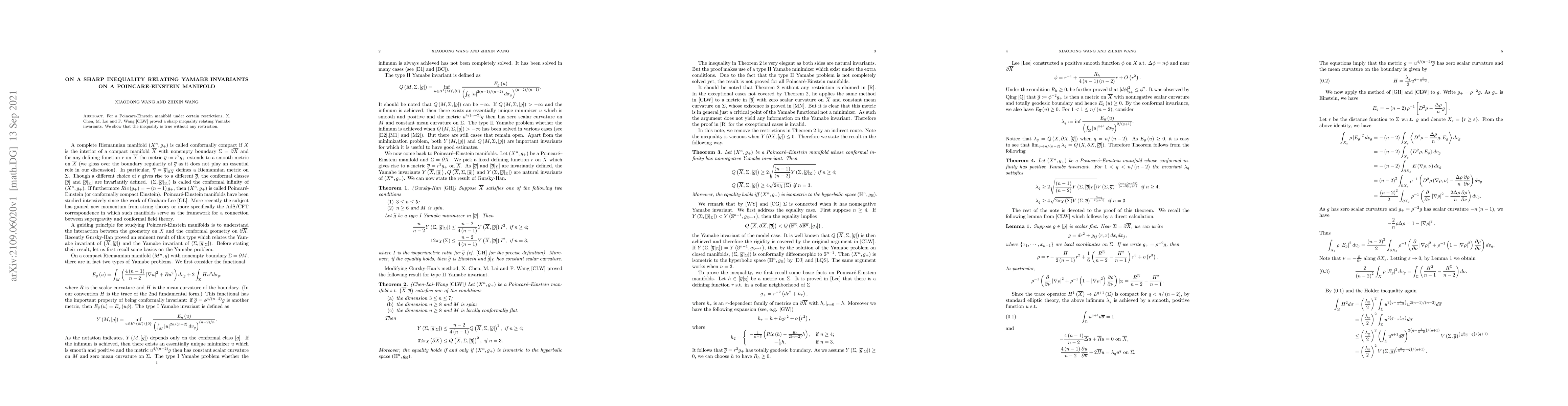 Researchers have proven a sharp inequality relating Yamabe invariants on Poincare-Einstein manifolds without restrictions, building upon previous work that had limitations.