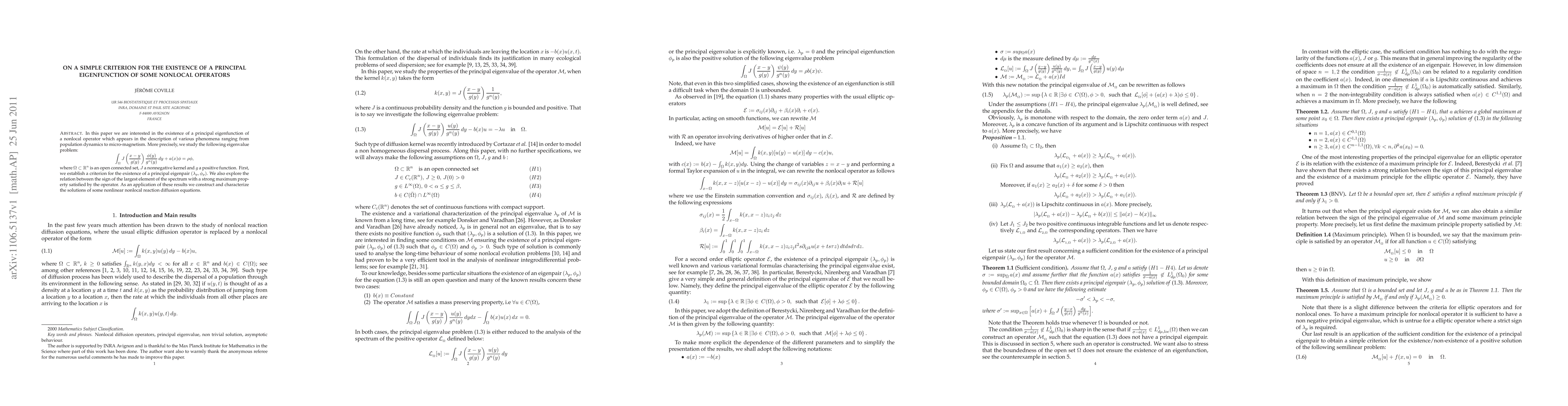 This paper establishes a criterion for the existence of a principal eigenfunction of a nonlocal operator, which is crucial for understanding phenomena in population dynamics and micro-magnetism. The study also explores the relationship between the largest eigenvalue's sign and the operator's strong maximum property, and applies these findings to characterize solutions of nonlinear nonlocal reaction-diffusion equations.